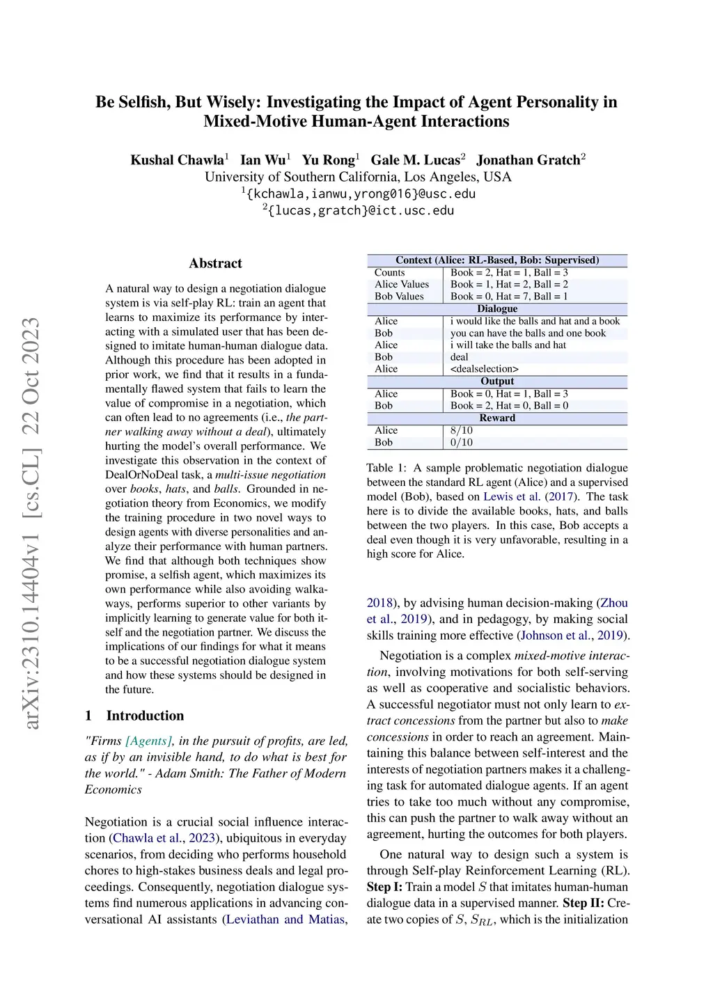 A natural way to design a negotiation dialogue system is via self-play RL: train an agent that learns to maximize its performance by interacting with a simulated user that has been designed to imitate human-human dialogue data. Although this procedure has been adopted in prior work, we find that it results in a fundamentally flawed system that fails to learn the value of compromise in a negotiation, which can often lead to no agreements (i.e., the partner walking away without a deal), ultimately hurting the model's overall performance. We investigate this observation in the context of the DealOrNoDeal task, a multi-issue negotiation over books, hats, and balls. Grounded in negotiation theory from Economics, we modify the training procedure in two novel ways to design agents with diverse personalities and analyze their performance with human partners. We find that although both techniques show promise, a selfish agent, which maximizes its own performance while also avoiding walkaways, performs superior to other variants by implicitly learning to generate value for both itself and the negotiation partner. We discuss the implications of our findings for what it means to be a successful negotiation dialogue system and how these systems should be designed in the future.