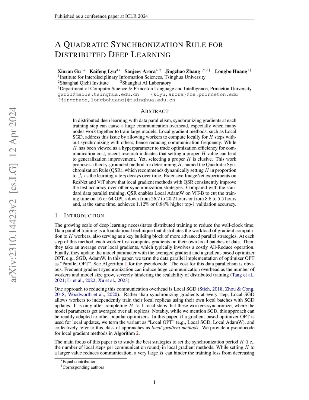 In distributed deep learning with data parallelism, synchronizing gradients at each training step can cause a huge communication overhead, especially when many nodes work together to train large models. Local gradient methods, such as Local SGD, address this issue by allowing workers to compute locally for steps without synchronizing with others, hence reducing communication frequency. While has been viewed as a hyperparameter to trade optimization efficiency for communication cost, recent research indicates that setting a proper value can lead to generalization improvement. Yet, selecting a proper is elusive. This work proposes a theory-grounded method for determining , named the Quadratic Synchronization Rule (QSR), which recommends dynamically setting in proportion to as the learning rate decays over time. Extensive ImageNet experiments on ResNet and ViT show that local gradient methods with QSR consistently improve the test accuracy over other synchronization strategies. Compared with the standard data parallel training, QSR enables Local AdamW on ViT-B to cut the training time on 16 or 64 GPUs down from 26.7 to 20.2 hours or from 8.6 to 5.5 hours and, at the same time, achieves or higher top-1 validation accuracy.
