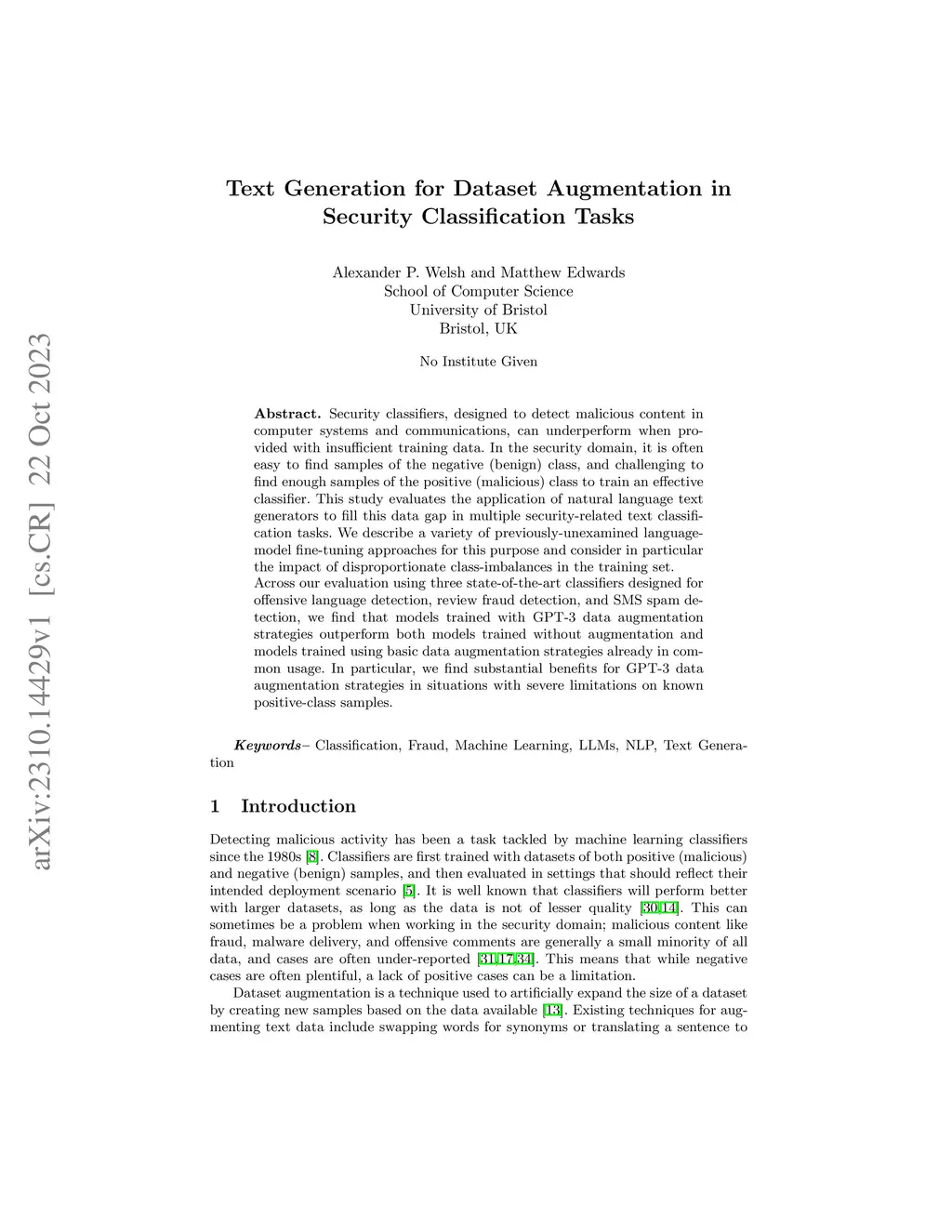 Security classifiers, designed to detect malicious content in computer systems and communications, can underperform when provided with insufficient training data. In the security domain, it is often easy to find samples of the negative (benign) class, and challenging to find enough samples of the positive (malicious) class to train an effective classifier. This study evaluates the application of natural language text generators to fill this data gap in multiple security-related text classification tasks. We describe a variety of previously-unexamined language-model fine-tuning approaches for this purpose and consider in particular the impact of disproportionate class-imbalances in the training set. Across our evaluation using three state-of-the-art classifiers designed for offensive language detection, review fraud detection, and SMS spam detection, we find that models trained with GPT-3 data augmentation strategies outperform both models trained without augmentation and models trained using basic data augmentation strategies already in common usage. In particular, we find substantial benefits for GPT-3 data augmentation strategies in situations with severe limitations on known positive-class samples.