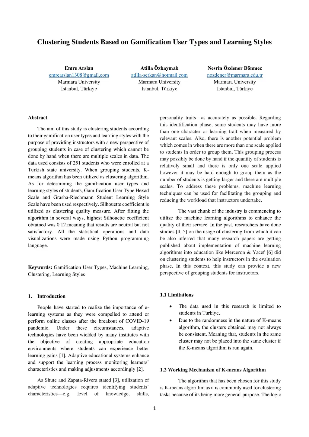 The aim of this study is clustering students according to their gamification user types and learning styles with the purpose of providing instructors with a new perspective of grouping students in case of clustering which cannot be done by hand when there are multiple scales in data. The data used consists of 251 students who were enrolled at a Turkish state university. When grouping students, K-means algorithm has been utilized as clustering algorithm. As for determining the gamification user types and learning styles of students, Gamification User Type Hexad Scale and Grasha-Riechmann Student Learning Style Scale have been used respectively. Silhouette coefficient is utilized as clustering quality measure. After fitting the algorithm in several ways, highest Silhouette coefficient obtained was 0.12 meaning that results are neutral but not satisfactory. All the statistical operations and data visualizations were made using Python programming language.