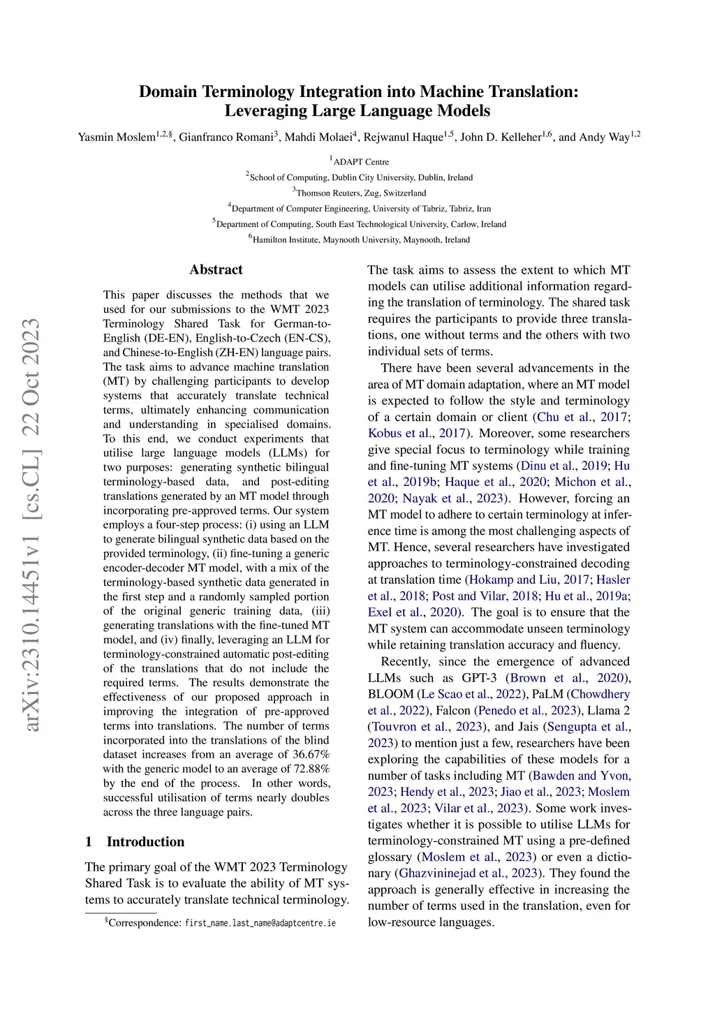 This paper discusses the methods that we used for our submissions to the WMT 2023 Terminology Shared Task for German-to-English (DE-EN), English-to-Czech (EN-CS), and Chinese-to-English (ZH-EN) language pairs. The task aims to advance machine translation (MT) by challenging participants to develop systems that accurately translate technical terms, ultimately enhancing communication and understanding in specialised domains. To this end, we conduct experiments that utilise large language models (LLMs) for two purposes: generating synthetic bilingual terminology-based data, and post-editing translations generated by an MT model through incorporating pre-approved terms. Our system employs a four-step process: (i) using an LLM to generate bilingual synthetic data based on the provided terminology, (ii) fine-tuning a generic encoder-decoder MT model, with a mix of the terminology-based synthetic data generated in the first step and a randomly sampled portion of the original generic training data, (iii) generating translations with the fine-tuned MT model, and (iv) finally, leveraging an LLM for terminology-constrained automatic post-editing of the translations that do not include the required terms. The results demonstrate the effectiveness of our proposed approach in improving the integration of pre-approved terms into translations. The number of terms incorporated into the translations of the blind dataset increases from an average of 36.67% with the generic model to an average of 72.88% by the end of the process. In other words, successful utilisation of terms nearly doubles across the three language pairs.