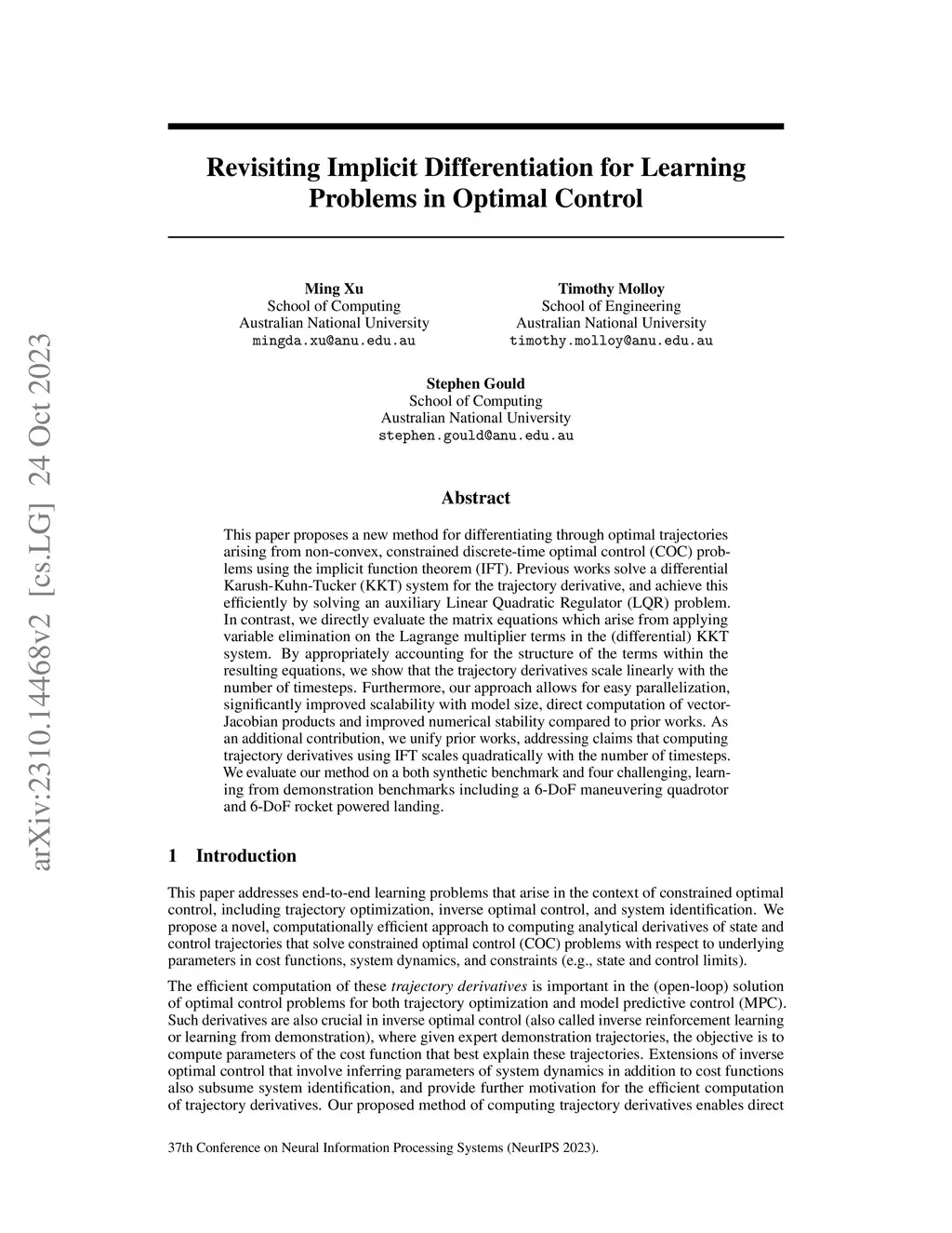 This paper proposes a new method for differentiating through optimal trajectories arising from non-convex, constrained discrete-time optimal control (COC) problems using the implicit function theorem (IFT). Previous works solve a differential Karush-Kuhn-Tucker (KKT) system for the trajectory derivative, and achieve this efficiently by solving an auxiliary Linear Quadratic Regulator (LQR) problem. In contrast, we directly evaluate the matrix equations which arise from applying variable elimination on the Lagrange multiplier terms in the (differential) KKT system. By appropriately accounting for the structure of the terms within the resulting equations, we show that the trajectory derivatives scale linearly with the number of timesteps. Furthermore, our approach allows for easy parallelization, significantly improved scalability with model size, direct computation of vector-Jacobian products and improved numerical stability compared to prior works. As an additional contribution, we unify prior works, addressing claims that computing trajectory derivatives using IFT scales quadratically with the number of timesteps. We evaluate our method on a both synthetic benchmark and four challenging, learning from demonstration benchmarks including a 6-DoF maneuvering quadrotor and 6-DoF rocket powered landing.