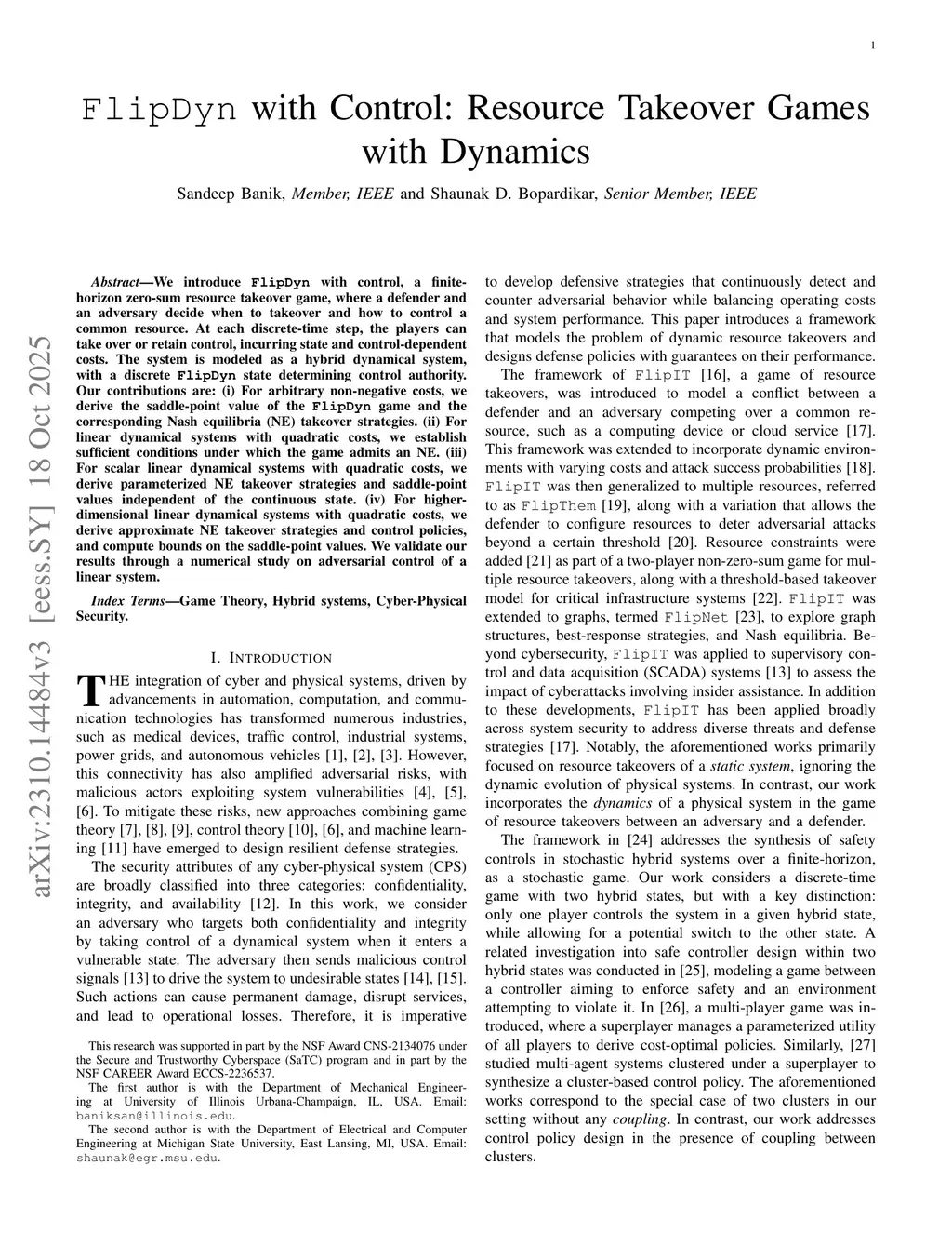 We present the FlipDyn, a dynamic game in which two opponents (a defender and an adversary) choose strategies to optimally takeover a resource that involves a dynamical system. At any time instant, each player can take over the resource and thereby control the dynamical system after incurring a state-dependent and a control-dependent costs. The resulting model becomes a hybrid dynamical system where the discrete state (FlipDyn state) determines which player is in control of the resource. Our objective is to compute the Nash equilibria of this dynamic zero-sum game. Our contributions are four-fold. First, for any non-negative costs, we present analytical expressions for the saddle-point value of the FlipDyn game, along with the corresponding Nash equilibrium (NE) takeover strategies. Second, for continuous state, linear dynamical systems with quadratic costs, we establish sufficient conditions under which the game admits a NE in the space of linear state-feedback policies. Third, for scalar dynamical systems with quadratic costs, we derive the NE takeover strategies and saddle-point values independent of the continuous state of the dynamical system. Fourth and finally, for higher dimensional linear dynamical systems with quadratic costs, we derive approximate NE takeover strategies and control policies which enable the computation of bounds on the value functions of the game in each takeover state. We illustrate our findings through a numerical study involving the control of a linear dynamical system in the presence of an adversary.