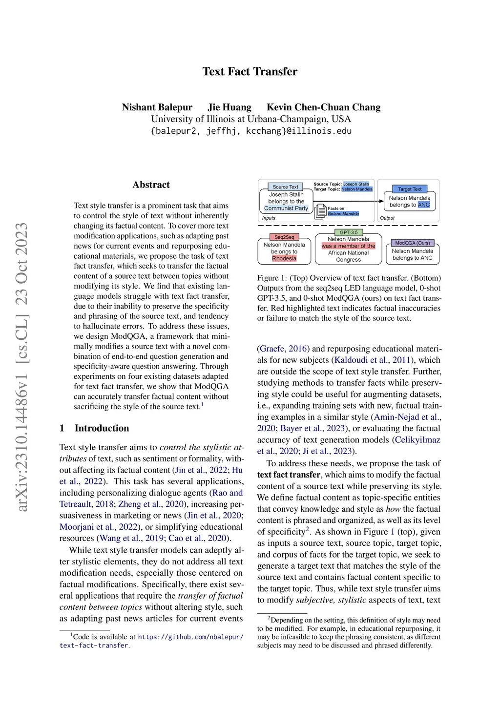 Text style transfer is a prominent task that aims to control the style of text without inherently changing its factual content. To cover more text modification applications, such as adapting past news for current events and repurposing educational materials, we propose the task of text fact transfer, which seeks to transfer the factual content of a source text between topics without modifying its style. We find that existing language models struggle with text fact transfer, due to their inability to preserve the specificity and phrasing of the source text, and tendency to hallucinate errors. To address these issues, we design ModQGA, a framework that minimally modifies a source text with a novel combination of end-to-end question generation and specificity-aware question answering. Through experiments on four existing datasets adapted for text fact transfer, we show that ModQGA can accurately transfer factual content without sacrificing the style of the source text.