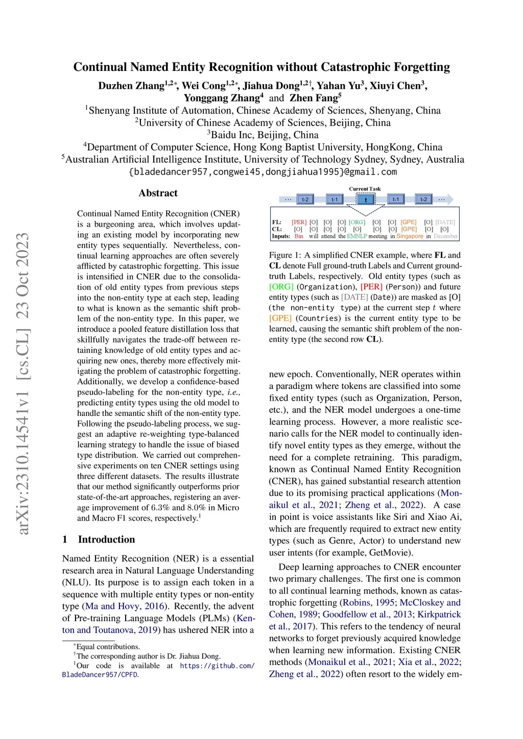 Continual Named Entity Recognition (CNER) is a burgeoning area, which involves updating an existing model by incorporating new entity types sequentially. Nevertheless, continual learning approaches are often severely afflicted by catastrophic forgetting. This issue is intensified in CNER due to the consolidation of old entity types from previous steps into the non-entity type at each step, leading to what is known as the semantic shift problem of the non-entity type. In this paper, we introduce a pooled feature distillation loss that skillfully navigates the trade-off between retaining knowledge of old entity types and acquiring new ones, thereby more effectively mitigating the problem of catastrophic forgetting. Additionally, we develop a confidence-based pseudo-labeling for the non-entity type, \emph{i.e.,} predicting entity types using the old model to handle the semantic shift of the non-entity type. Following the pseudo-labeling process, we suggest an adaptive re-weighting type-balanced learning strategy to handle the issue of biased type distribution. We carried out comprehensive experiments on ten CNER settings using three different datasets. The results illustrate that our method significantly outperforms prior state-of-the-art approaches, registering an average improvement of \% and \% in Micro and Macro F1 scores, respectively.