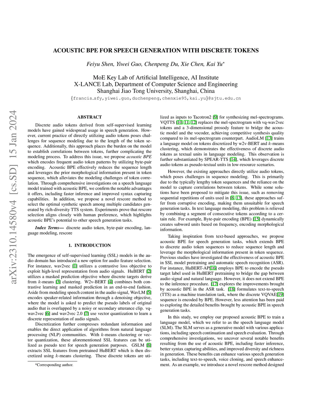 Discrete audio tokens derived from self-supervised learning models have gained widespread usage in speech generation. However, current practice of directly utilizing audio tokens poses challenges for sequence modeling due to the length of the token sequence. Additionally, this approach places the burden on the model to establish correlations between tokens, further complicating the modeling process. To address this issue, we propose acoustic BPE which encodes frequent audio token patterns by utilizing byte-pair encoding. Acoustic BPE effectively reduces the sequence length and leverages the prior morphological information present in token sequence, which alleviates the modeling challenges of token correlation. Through comprehensive investigations on a speech language model trained with acoustic BPE, we confirm the notable advantages it offers, including faster inference and improved syntax capturing capabilities. In addition, we propose a novel rescore method to select the optimal synthetic speech among multiple candidates generated by rich-diversity TTS system. Experiments prove that rescore selection aligns closely with human preference, which highlights acoustic BPE's potential to other speech generation tasks.