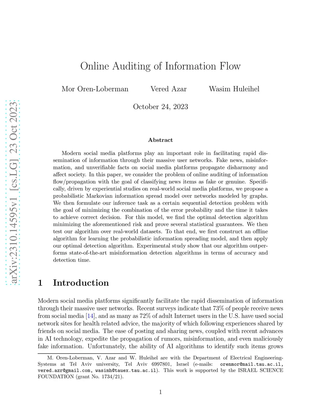 Modern social media platforms play an important role in facilitating rapid dissemination of information through their massive user networks. Fake news, misinformation, and unverifiable facts on social media platforms propagate disharmony and affect society. In this paper, we consider the problem of online auditing of information flow/propagation with the goal of classifying news items as fake or genuine. Specifically, driven by experiential studies on real-world social media platforms, we propose a probabilistic Markovian information spread model over networks modeled by graphs. We then formulate our inference task as a certain sequential detection problem with the goal of minimizing the combination of the error probability and the time it takes to achieve correct decision. For this model, we find the optimal detection algorithm minimizing the aforementioned risk and prove several statistical guarantees. We then test our algorithm over real-world datasets. To that end, we first construct an offline algorithm for learning the probabilistic information spreading model, and then apply our optimal detection algorithm. Experimental study show that our algorithm outperforms state-of-the-art misinformation detection algorithms in terms of accuracy and detection time.