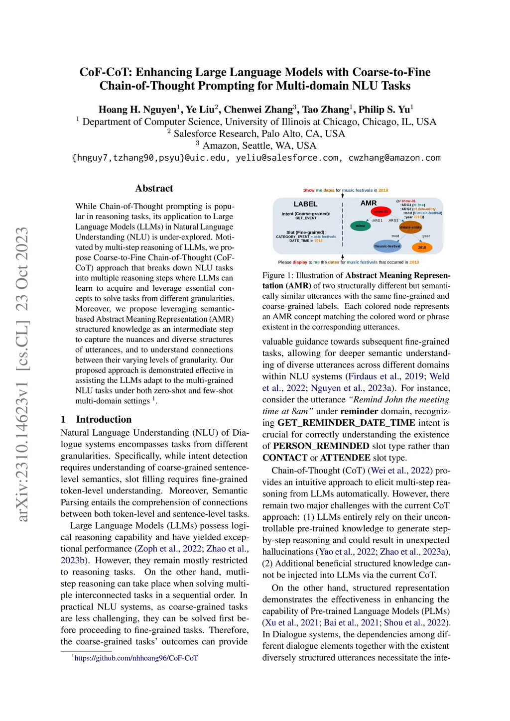 While Chain-of-Thought prompting is popular in reasoning tasks, its application to Large Language Models (LLMs) in Natural Language Understanding (NLU) is under-explored. Motivated by multi-step reasoning of LLMs, we propose Coarse-to-Fine Chain-of-Thought (CoF-CoT) approach that breaks down NLU tasks into multiple reasoning steps where LLMs can learn to acquire and leverage essential concepts to solve tasks from different granularities. Moreover, we propose leveraging semantic-based Abstract Meaning Representation (AMR) structured knowledge as an intermediate step to capture the nuances and diverse structures of utterances, and to understand connections between their varying levels of granularity. Our proposed approach is demonstrated effective in assisting the LLMs adapt to the multi-grained NLU tasks under both zero-shot and few-shot multi-domain settings.