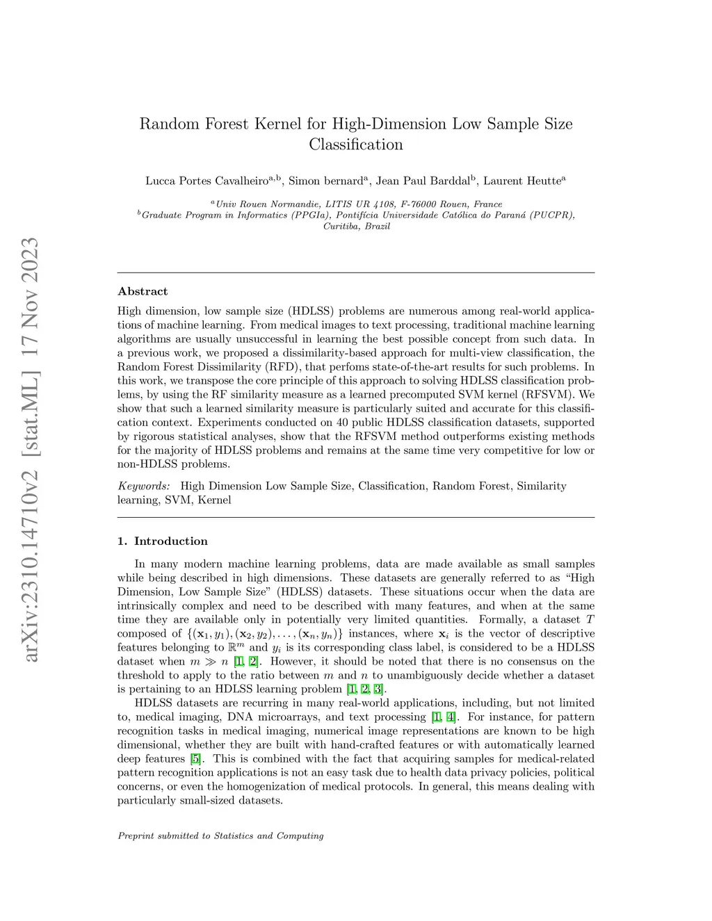 High dimension, low sample size (HDLSS) problems are numerous among real-world applications of machine learning. From medical images to text processing, traditional machine learning algorithms are usually unsuccessful in learning the best possible concept from such data. In a previous work, we proposed a dissimilarity-based approach for multi-view classification, the Random Forest Dissimilarity (RFD), that perfoms state-of-the-art results for such problems. In this work, we transpose the core principle of this approach to solving HDLSS classification problems, by using the RF similarity measure as a learned precomputed SVM kernel (RFSVM). We show that such a learned similarity measure is particularly suited and accurate for this classification context. Experiments conducted on 40 public HDLSS classification datasets, supported by rigorous statistical analyses, show that the RFSVM method outperforms existing methods for the majority of HDLSS problems and remains at the same time very competitive for low or non-HDLSS problems.