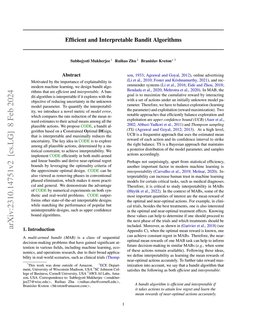 Motivated by the importance of explainability in modern machine learning, we design bandit algorithms that are efficient and interpretable. A bandit algorithm is interpretable if it explores with the objective of reducing uncertainty in the unknown model parameter. To quantify the interpretability, we introduce a novel metric of model error, which compares the rate reduction of the mean reward estimates to their actual means among all the plausible actions. We propose CODE, a bandit algorithm based on a Constrained Optimal DEsign, that is interpretable and maximally reduces the uncertainty. The key idea in CODE is to explore among all plausible actions, determined by a statistical constraint, to achieve interpretability. We implement CODE efficiently in both multi-armed and linear bandits and derive near-optimal regret bounds by leveraging the optimality criteria of the approximate optimal design. CODE can be also viewed as removing phases in conventional phased elimination, which makes it more practical and general. We demonstrate the advantage of CODE by numerical experiments on both synthetic and real-world problems. CODE outperforms other state-of-the-art interpretable designs while matching the performance of popular but uninterpretable designs, such as upper confidence bound algorithms.