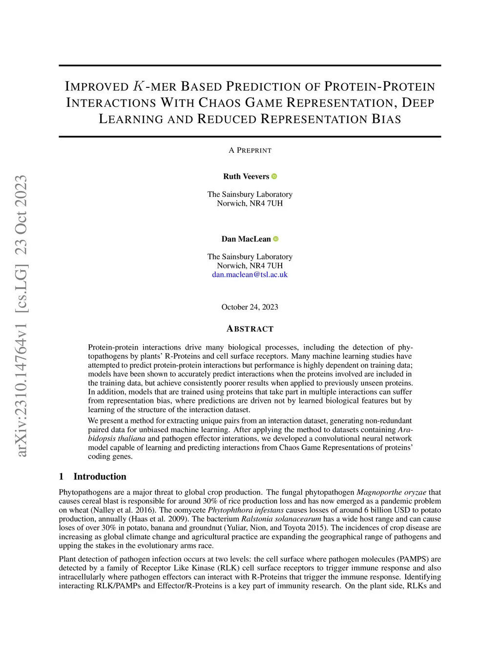 Protein-protein interactions drive many biological processes, including the detection of phytopathogens by plants' R-Proteins and cell surface receptors. Many machine learning studies have attempted to predict protein-protein interactions but performance is highly dependent on training data; models have been shown to accurately predict interactions when the proteins involved are included in the training data, but achieve consistently poorer results when applied to previously unseen proteins. In addition, models that are trained using proteins that take part in multiple interactions can suffer from representation bias, where predictions are driven not by learned biological features but by learning of the structure of the interaction dataset. We present a method for extracting unique pairs from an interaction dataset, generating non-redundant paired data for unbiased machine learning. After applying the method to datasets containing _Arabidopsis thaliana_ and pathogen effector interations, we developed a convolutional neural network model capable of learning and predicting interactions from Chaos Game Representations of proteins' coding genes.