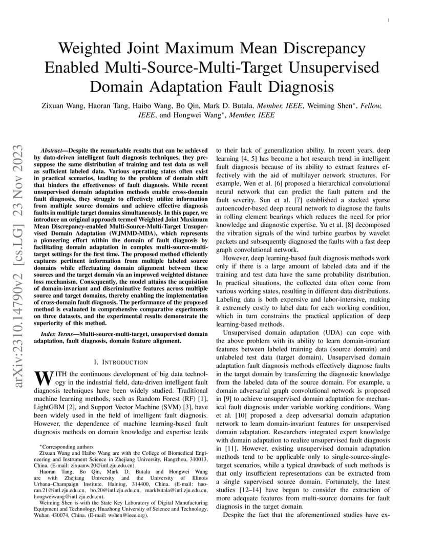 Despite the remarkable results that can be achieved by data-driven intelligent fault diagnosis techniques, they presuppose the same distribution of training and test data as well as sufficient labeled data. Various operating states often exist in practical scenarios, leading to the problem of domain shift that hinders the effectiveness of fault diagnosis. While recent unsupervised domain adaptation methods enable cross-domain fault diagnosis, they struggle to effectively utilize information from multiple source domains and achieve effective diagnosis faults in multiple target domains simultaneously. In this paper, we innovatively proposed a weighted joint maximum mean discrepancy enabled multi-source-multi-target unsupervised domain adaptation (WJMMD-MDA), which realizes domain adaptation under multi-source-multi-target scenarios in the field of fault diagnosis for the first time. The proposed method extracts sufficient information from multiple labeled source domains and achieves domain alignment between source and target domains through an improved weighted distance loss. As a result, domain-invariant and discriminative features between multiple source and target domains are learned with cross-domain fault diagnosis realized. The performance of the proposed method is evaluated in comprehensive comparative experiments on three datasets, and the experimental results demonstrate the superiority of this method.