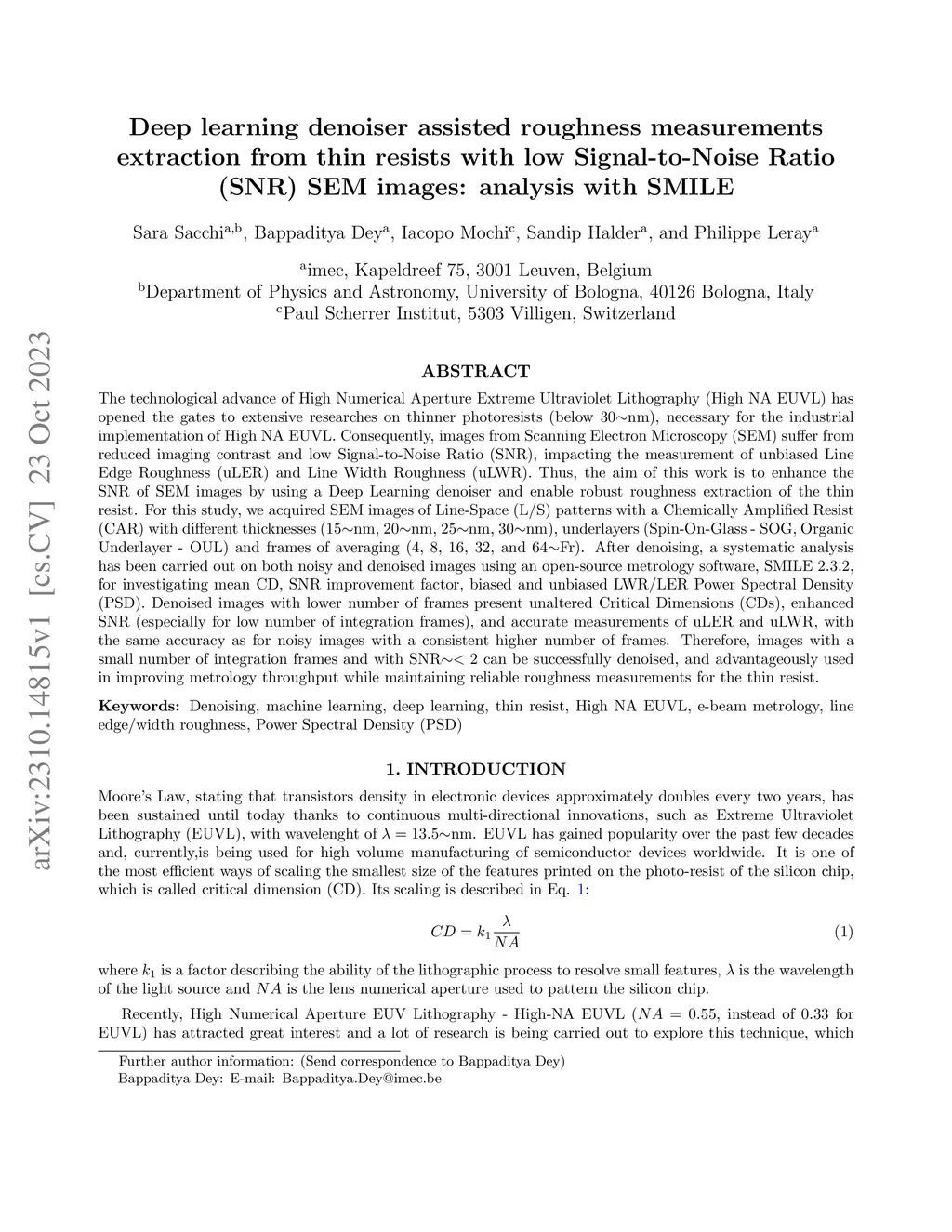 thin resists with low Signal-to-Noise Ratio(SNR) SEM images: analysis with
