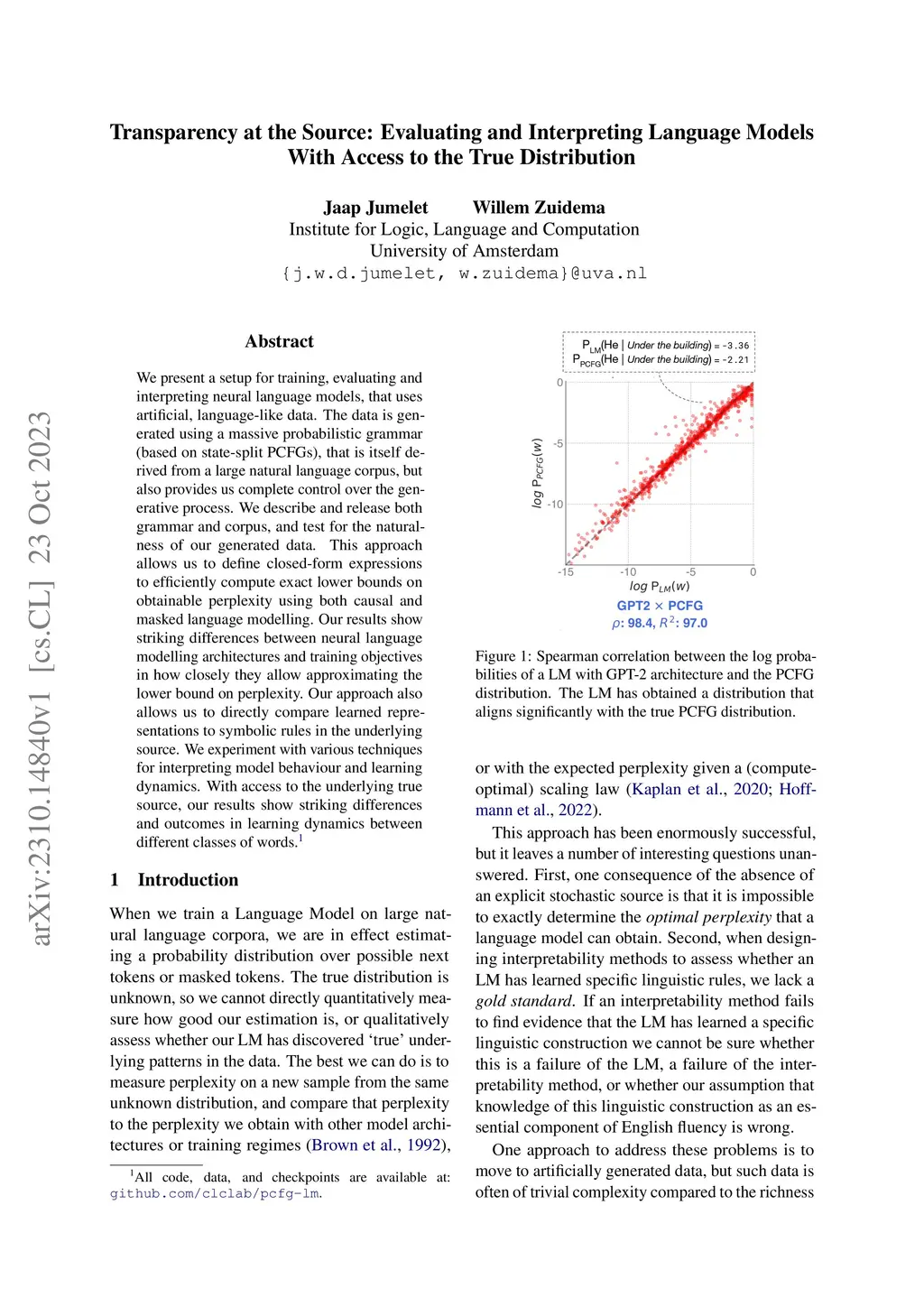 We present a setup for training, evaluating and interpreting neural language models, that uses artificial, language-like data. The data is generated using a massive probabilistic grammar (based on state-split PCFGs), that is itself derived from a large natural language corpus, but also provides us complete control over the generative process. We describe and release both grammar and corpus, and test for the naturalness of our generated data. This approach allows us to define closed-form expressions to efficiently compute exact lower bounds on obtainable perplexity using both causal and masked language modelling. Our results show striking differences between neural language modelling architectures and training objectives in how closely they allow approximating the lower bound on perplexity. Our approach also allows us to directly compare learned representations to symbolic rules in the underlying source. We experiment with various techniques for interpreting model behaviour and learning dynamics. With access to the underlying true source, our results show striking differences and outcomes in learning dynamics between different classes of words.