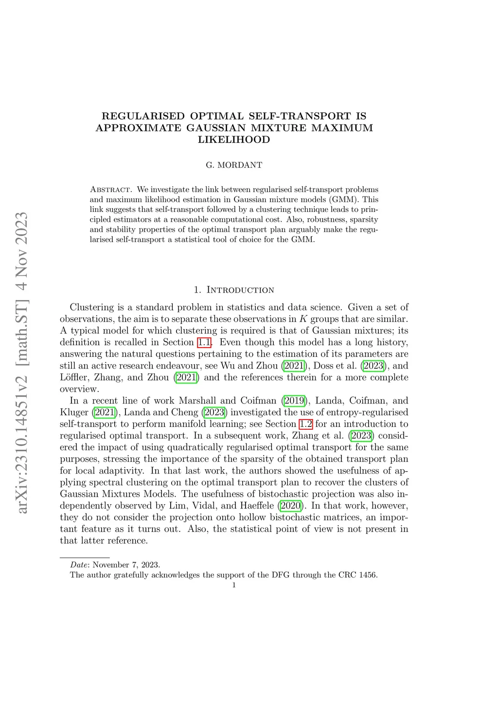 We investigate the link between regularised self-transport problems and maximum likelihood estimation in Gaussian mixture models (GMM). This link suggests that self-transport followed by a clustering technique leads to principled estimators at a reasonable computational cost. Also, robustness, sparsity and stability properties of the optimal transport plan arguably make the regularised self-transport a statistical tool of choice for the GMM.