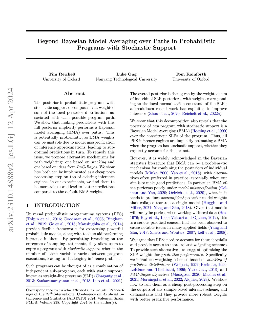 The posterior in probabilistic programs with stochastic support decomposes as a weighted sum of the local posterior distributions associated with each possible program path. We show that making predictions with this full posterior implicitly performs a Bayesian model averaging (BMA) over paths. This is potentially problematic, as BMA weights can be unstable due to model misspecification or inference approximations, leading to sub-optimal predictions in turn. To remedy this issue, we propose alternative mechanisms for path weighting: one based on stacking and one based on ideas from PAC-Bayes. We show how both can be implemented as a cheap post-processing step on top of existing inference engines. In our experiments, we find them to be more robust and lead to better predictions compared to the default BMA weights.
