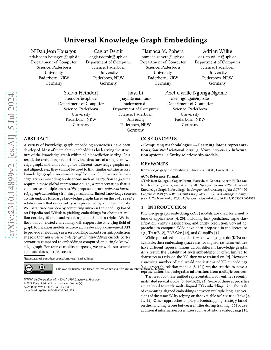 A variety of knowledge graph embedding approaches have been developed. Most of them obtain embeddings by learning the structure of the knowledge graph within a link prediction setting. As a result, the embeddings reflect only the structure of a single knowledge graph, and embeddings for different knowledge graphs are not aligned, e.g., they cannot be used to find similar entities across knowledge graphs via nearest neighbor search. However, knowledge graph embedding applications such as entity disambiguation require a more global representation, i.e., a representation that is valid across multiple sources. We propose to learn universal knowledge graph embeddings from large-scale interlinked knowledge sources. To this end, we fuse large knowledge graphs based on the owl:sameAs relation such that every entity is represented by a unique identity. We instantiate our idea by computing universal embeddings based on DBpedia and Wikidata yielding embeddings for about 180 million entities, 15 thousand relations, and 1.2 billion triples. We believe our computed embeddings will support the emerging field of graph foundation models. Moreover, we develop a convenient API to provide embeddings as a service. Experiments on link prediction suggest that universal knowledge graph embeddings encode better semantics compared to embeddings computed on a single knowledge graph. For reproducibility purposes, we provide our source code and datasets open access.
