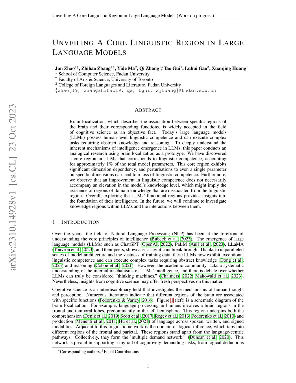 Brain localization, which describes the association between specific regions of the brain and their corresponding functions, is widely accepted in the field of cognitive science as an objective fact. Today's large language models (LLMs) possess human-level linguistic competence and can execute complex tasks requiring abstract knowledge and reasoning. To deeply understand the inherent mechanisms of intelligence emergence in LLMs, this paper conducts an analogical research using brain localization as a prototype. We have discovered a core region in LLMs that corresponds to linguistic competence, accounting for approximately 1% of the total model parameters. This core region exhibits significant dimension dependency, and perturbations to even a single parameter on specific dimensions can lead to a loss of linguistic competence. Furthermore, we observe that an improvement in linguistic competence does not necessarily accompany an elevation in the model's knowledge level, which might imply the existence of regions of domain knowledge that are dissociated from the linguistic region. Overall, exploring the LLMs' functional regions provides insights into the foundation of their intelligence. In the future, we will continue to investigate knowledge regions within LLMs and the interactions between them.