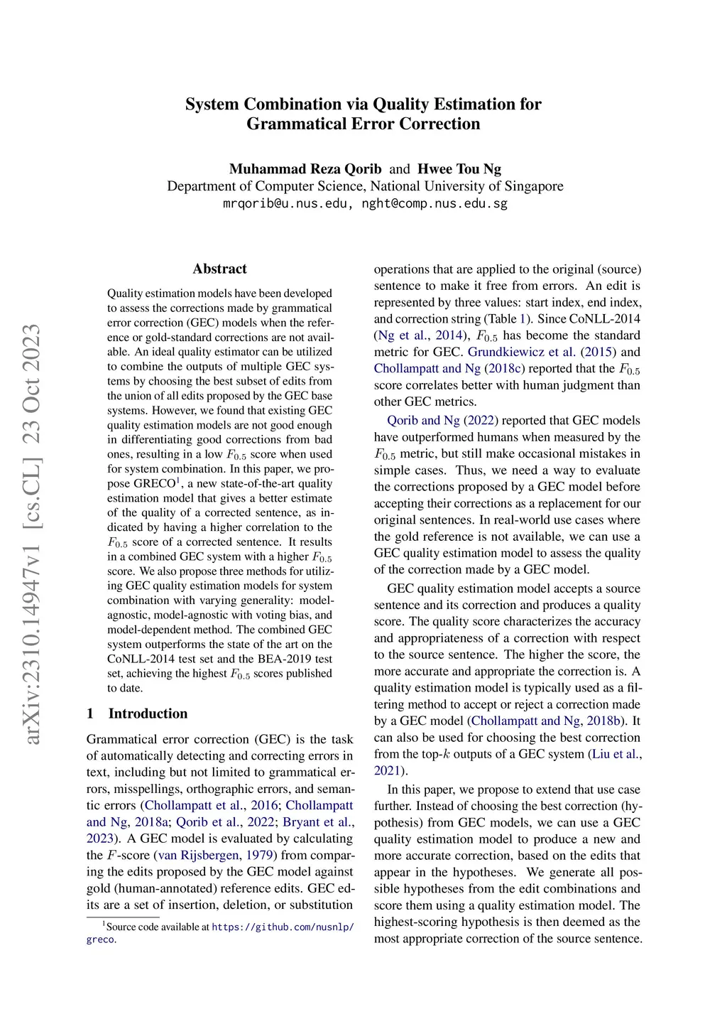 Quality estimation models have been developed to assess the corrections made by grammatical error correction (GEC) models when the reference or gold-standard corrections are not available. An ideal quality estimator can be utilized to combine the outputs of multiple GEC systems by choosing the best subset of edits from the union of all edits proposed by the GEC base systems. However, we found that existing GEC quality estimation models are not good enough in differentiating good corrections from bad ones, resulting in a low F0.5 score when used for system combination. In this paper, we propose GRECO, a new state-of-the-art quality estimation model that gives a better estimate of the quality of a corrected sentence, as indicated by having a higher correlation to the F0.5 score of a corrected sentence. It results in a combined GEC system with a higher F0.5 score. We also propose three methods for utilizing GEC quality estimation models for system combination with varying generality: model-agnostic, model-agnostic with voting bias, and model-dependent method. The combined GEC system outperforms the state of the art on the CoNLL-2014 test set and the BEA-2019 test set, achieving the highest F0.5 scores published to date.