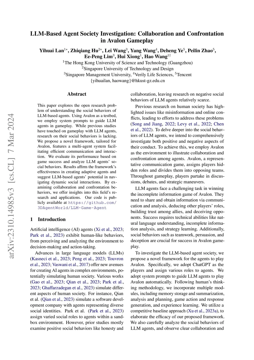 This paper aims to investigate the open research problem of uncovering the social behaviors of LLM-based agents. To achieve this goal, we adopt Avalon, a representative communication game, as the environment and use system prompts to guide LLM agents to play the game. While previous studies have conducted preliminary investigations into gameplay with LLM agents, there lacks research on their social behaviors. In this paper, we present a novel framework designed to seamlessly adapt to Avalon gameplay. The core of our proposed framework is a multi-agent system that enables efficient communication and interaction among agents. We evaluate the performance of our framework based on metrics from two perspectives: winning the game and analyzing the social behaviors of LLM agents. Our results demonstrate the effectiveness of our framework in generating adaptive and intelligent agents and highlight the potential of LLM-based agents in addressing the challenges associated with dynamic social environment interaction. By analyzing the social behaviors of LLM agents from the aspects of both collaboration and confrontation, we provide insights into the research and applications of this domain. Our code is publicly available at https://github.com/3DAgentWorld/LLM-Game-Agent