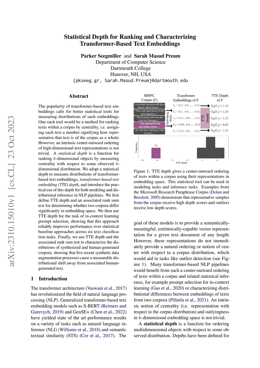 The popularity of transformer-based text embeddings calls for better statistical tools for measuring distributions of such embeddings. One such tool would be a method for ranking texts within a corpus by centrality, i.e. assigning each text a number signifying how representative that text is of the corpus as a whole. However, an intrinsic center-outward ordering of high-dimensional text representations is not trivial. A statistical depth is a function for ranking k-dimensional objects by measuring centrality with respect to some observed k-dimensional distribution. We adopt a statistical depth to measure distributions of transformer-based text embeddings, transformer-based text embedding (TTE) depth, and introduce the practical use of this depth for both modeling and distributional inference in NLP pipelines. We first define TTE depth and an associated rank sum test for determining whether two corpora differ significantly in embedding space. We then use TTE depth for the task of in-context learning prompt selection, showing that this approach reliably improves performance over statistical baseline approaches across six text classification tasks. Finally, we use TTE depth and the associated rank sum test to characterize the distributions of synthesized and human-generated corpora, showing that five recent synthetic data augmentation processes cause a measurable distributional shift away from associated human-generated text.