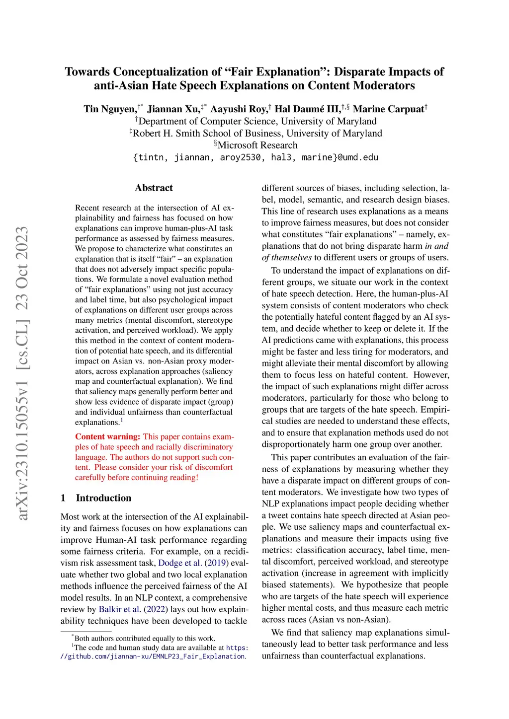 Recent research at the intersection of AI explainability and fairness has focused on how explanations can improve human-plus-AI task performance as assessed by fairness measures. We propose to characterize what constitutes an explanation that is itself "fair" -- an explanation that does not adversely impact specific populations. We formulate a novel evaluation method of "fair explanations" using not just accuracy and label time, but also psychological impact of explanations on different user groups across many metrics (mental discomfort, stereotype activation, and perceived workload). We apply this method in the context of content moderation of potential hate speech, and its differential impact on Asian vs. non-Asian proxy moderators, across explanation approaches (saliency map and counterfactual explanation). We find that saliency maps generally perform better and show less evidence of disparate impact (group) and individual unfairness than counterfactual explanations. Content warning: This paper contains examples of hate speech and racially discriminatory language. The authors do not support such content. Please consider your risk of discomfort carefully before continuing reading!