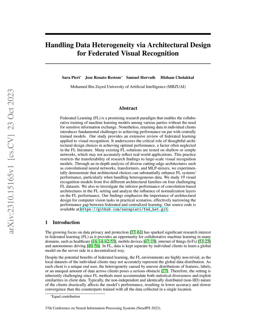 Federated Learning (FL) is a promising research paradigm that enables the collaborative training of machine learning models among various parties without the need for sensitive information exchange. Nonetheless, retaining data in individual clients introduces fundamental challenges to achieving performance on par with centrally trained models. Our study provides an extensive review of federated learning applied to visual recognition. It underscores the critical role of thoughtful architectural design choices in achieving optimal performance, a factor often neglected in the FL literature. Many existing FL solutions are tested on shallow or simple networks, which may not accurately reflect real-world applications. This practice restricts the transferability of research findings to large-scale visual recognition models. Through an in-depth analysis of diverse cutting-edge architectures such as convolutional neural networks, transformers, and MLP-mixers, we experimentally demonstrate that architectural choices can substantially enhance FL systems' performance, particularly when handling heterogeneous data. We study 19 visual recognition models from five different architectural families on four challenging FL datasets. We also re-investigate the inferior performance of convolution-based architectures in the FL setting and analyze the influence of normalization layers on the FL performance. Our findings emphasize the importance of architectural design for computer vision tasks in practical scenarios, effectively narrowing the performance gap between federated and centralized learning. Our source code is available at https://github.com/sarapieri/fed_het.git.