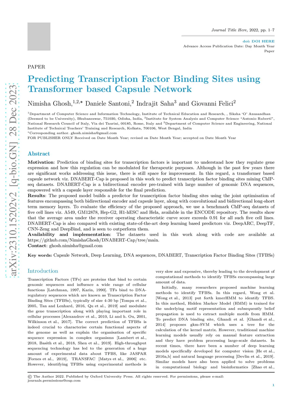 Prediction of binding sites for transcription factors is important to understand how they regulate gene expression and how this regulation can be modulated for therapeutic purposes. Although in the past few years there are significant works addressing this issue, there is still space for improvement. In this regard, a transformer based capsule network viz. DNABERT-Cap is proposed in this work to predict transcription factor binding sites mining ChIP-seq datasets. DNABERT-Cap is a bidirectional encoder pre-trained with large number of genomic DNA sequences, empowered with a capsule layer responsible for the final prediction. The proposed model builds a predictor for transcription factor binding sites using the joint optimisation of features encompassing both bidirectional encoder and capsule layer, along with convolutional and bidirectional long-short term memory layers. To evaluate the efficiency of the proposed approach, we use a benchmark ChIP-seq datasets of five cell lines viz. A549, GM12878, Hep-G2, H1-hESC and Hela, available in the ENCODE repository. The results show that the average area under the receiver operating characteristic curve score exceeds 0.91 for all such five cell lines. DNABERT-Cap is also compared with existing state-of-the-art deep learning based predictors viz. DeepARC, DeepTF, CNN-Zeng and DeepBind, and is seen to outperform them.