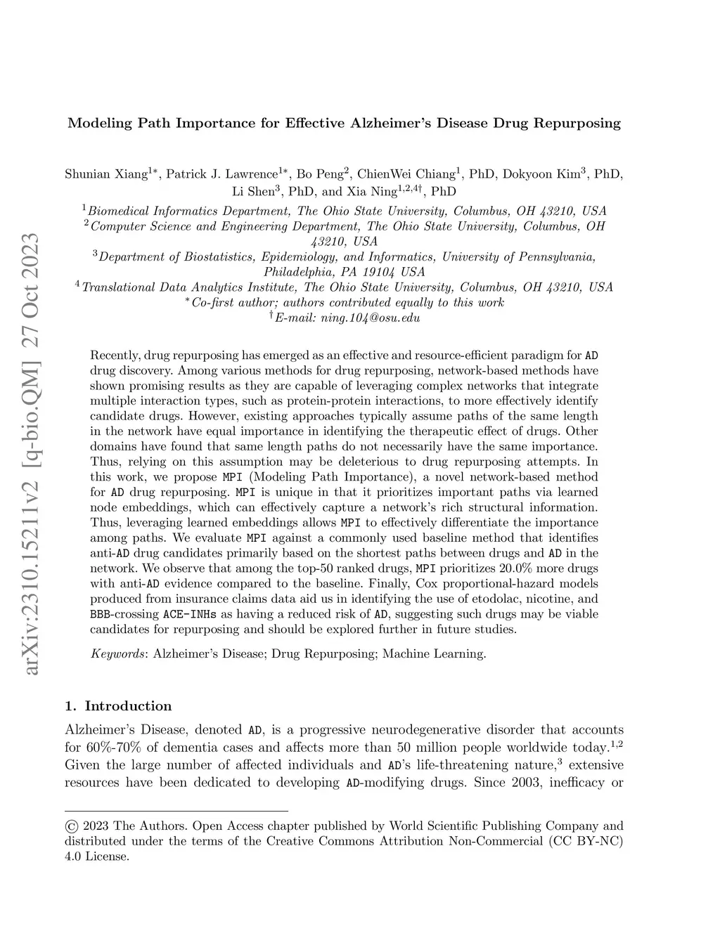 Recently, drug repurposing has emerged as an effective and resource-efficient paradigm for AD drug discovery. Among various methods for drug repurposing, network-based methods have shown promising results as they are capable of leveraging complex networks that integrate multiple interaction types, such as protein-protein interactions, to more effectively identify candidate drugs. However, existing approaches typically assume paths of the same length in the network have equal importance in identifying the therapeutic effect of drugs. Other domains have found that same length paths do not necessarily have the same importance. Thus, relying on this assumption may be deleterious to drug repurposing attempts. In this work, we propose MPI (Modeling Path Importance), a novel network-based method for AD drug repurposing. MPI is unique in that it prioritizes important paths via learned node embeddings, which can effectively capture a network's rich structural information. Thus, leveraging learned embeddings allows MPI to effectively differentiate the importance among paths. We evaluate MPI against a commonly used baseline method that identifies anti-AD drug candidates primarily based on the shortest paths between drugs and AD in the network. We observe that among the top-50 ranked drugs, MPI prioritizes 20.0% more drugs with anti-AD evidence compared to the baseline. Finally, Cox proportional-hazard models produced from insurance claims data aid us in identifying the use of etodolac, nicotine, and BBB-crossing ACE-INHs as having a reduced risk of AD, suggesting such drugs may be viable candidates for repurposing and should be explored further in future studies.