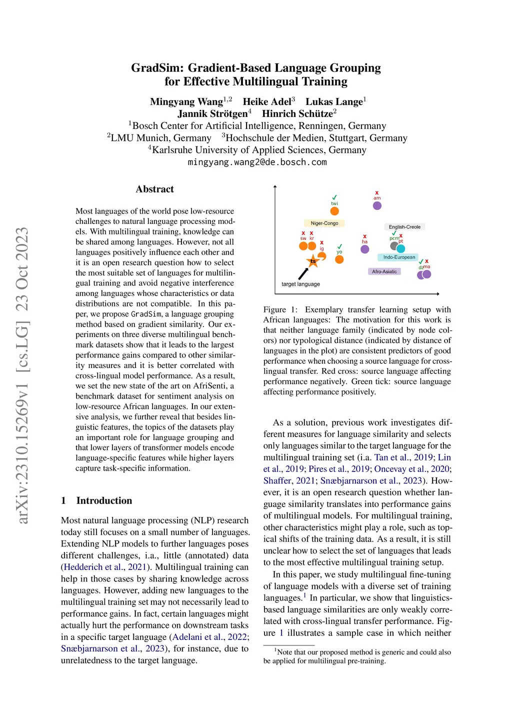 Most languages of the world pose low-resource challenges to natural language processing models. With multilingual training, knowledge can be shared among languages. However, not all languages positively influence each other and it is an open research question how to select the most suitable set of languages for multilingual training and avoid negative interference among languages whose characteristics or data distributions are not compatible. In this paper, we propose GradSim, a language grouping method based on gradient similarity. Our experiments on three diverse multilingual benchmark datasets show that it leads to the largest performance gains compared to other similarity measures and it is better correlated with cross-lingual model performance. As a result, we set the new state of the art on AfriSenti, a benchmark dataset for sentiment analysis on low-resource African languages. In our extensive analysis, we further reveal that besides linguistic features, the topics of the datasets play an important role for language grouping and that lower layers of transformer models encode language-specific features while higher layers capture task-specific information.
