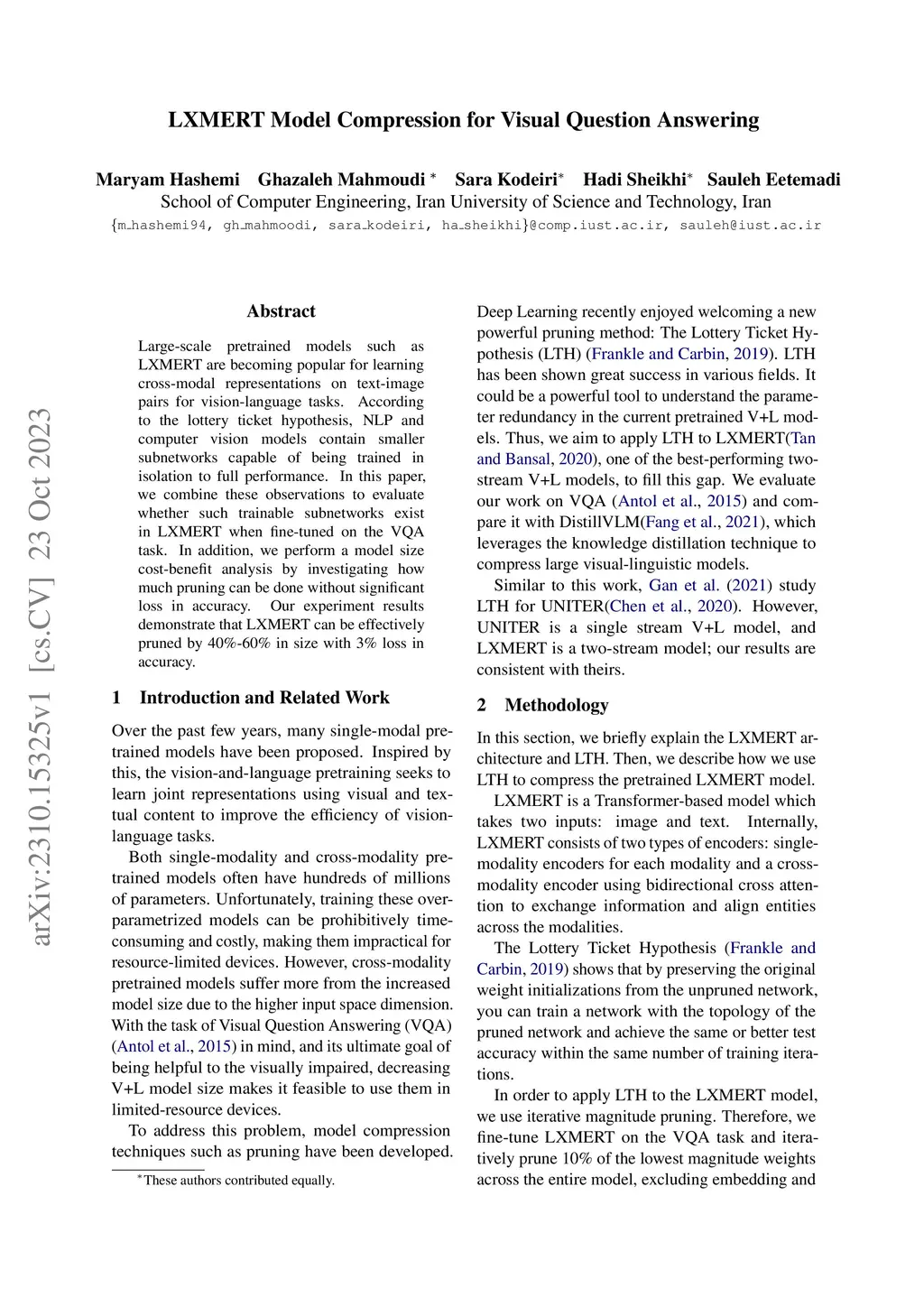 Large-scale pretrained models such as LXMERT are becoming popular for learning cross-modal representations on text-image pairs for vision-language tasks. According to the lottery ticket hypothesis, NLP and computer vision models contain smaller subnetworks capable of being trained in isolation to full performance. In this paper, we combine these observations to evaluate whether such trainable subnetworks exist in LXMERT when fine-tuned on the VQA task. In addition, we perform a model size cost-benefit analysis by investigating how much pruning can be done without significant loss in accuracy. Our experiment results demonstrate that LXMERT can be effectively pruned by 40%-60% in size with 3% loss in accuracy.