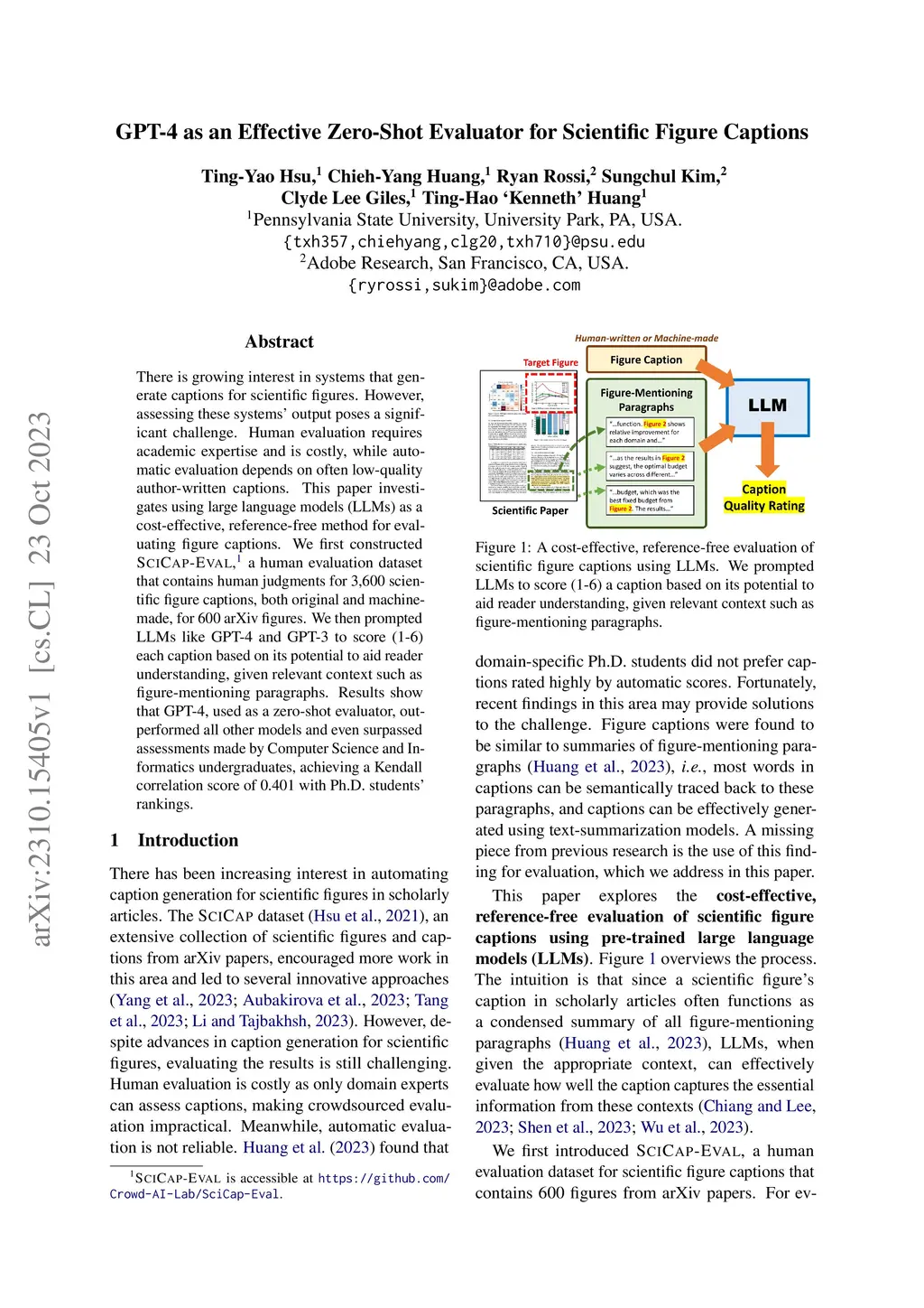 There is growing interest in systems that generate captions for scientific figures. However, assessing these systems output poses a significant challenge. Human evaluation requires academic expertise and is costly, while automatic evaluation depends on often low-quality author-written captions. This paper investigates using large language models (LLMs) as a cost-effective, reference-free method for evaluating figure captions. We first constructed SCICAP-EVAL, a human evaluation dataset that contains human judgments for 3,600 scientific figure captions, both original and machine-made, for 600 arXiv figures. We then prompted LLMs like GPT-4 and GPT-3 to score (1-6) each caption based on its potential to aid reader understanding, given relevant context such as figure-mentioning paragraphs. Results show that GPT-4, used as a zero-shot evaluator, outperformed all other models and even surpassed assessments made by Computer Science and Informatics undergraduates, achieving a Kendall correlation score of 0.401 with Ph.D. students rankings