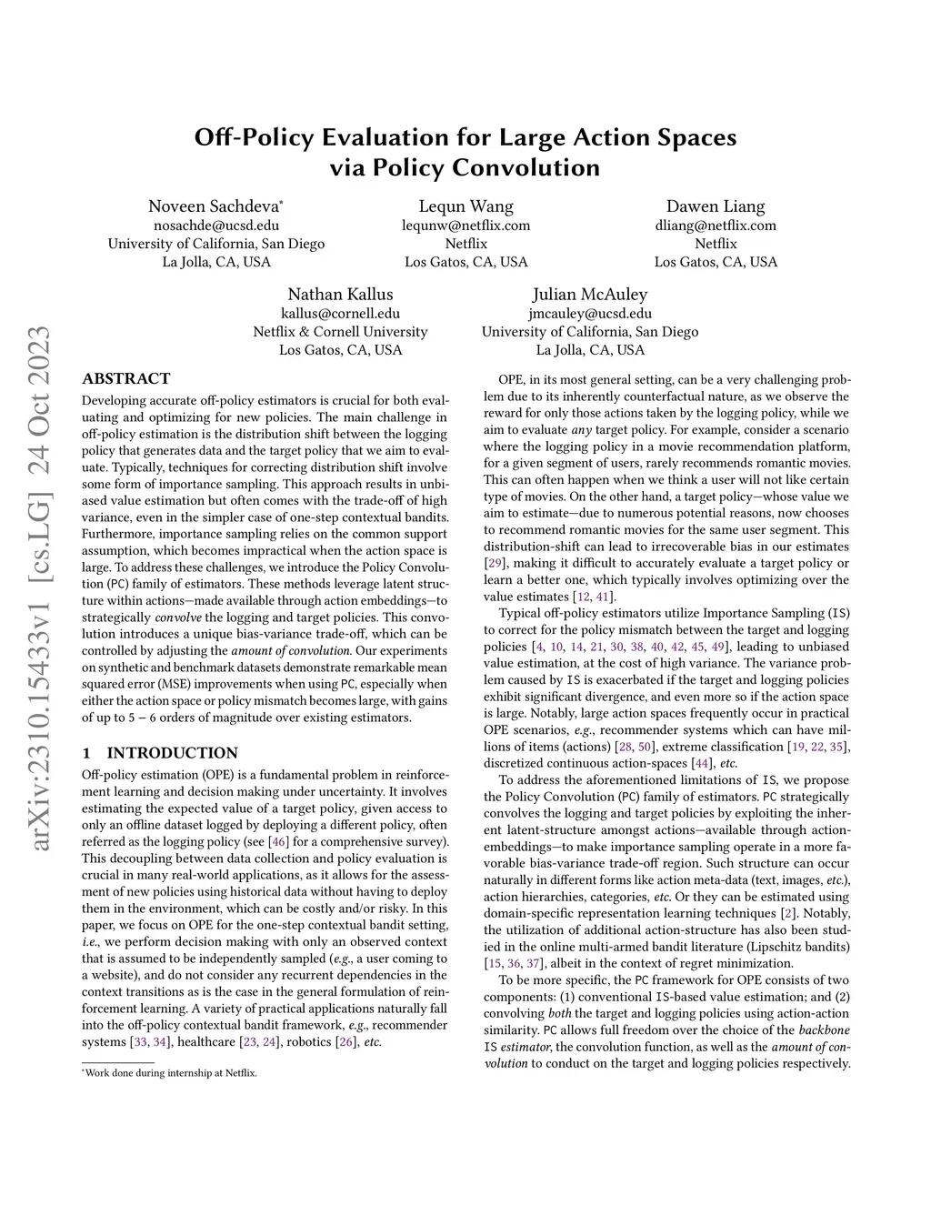 Developing accurate off-policy estimators is crucial for both evaluating and optimizing for new policies. The main challenge in off-policy estimation is the distribution shift between the logging policy that generates data and the target policy that we aim to evaluate. Typically, techniques for correcting distribution shift involve some form of importance sampling. This approach results in unbiased value estimation but often comes with the trade-off of high variance, even in the simpler case of one-step contextual bandits. Furthermore, importance sampling relies on the common support assumption, which becomes impractical when the action space is large. To address these challenges, we introduce the Policy Convolution (PC) family of estimators. These methods leverage latent structure within actions -- made available through action embeddings -- to strategically convolve the logging and target policies. This convolution introduces a unique bias-variance trade-off, which can be controlled by adjusting the amount of convolution. Our experiments on synthetic and benchmark datasets demonstrate remarkable mean squared error (MSE) improvements when using PC, especially when either the action space or policy mismatch becomes large, with gains of up to 5 - 6 orders of magnitude over existing estimators.