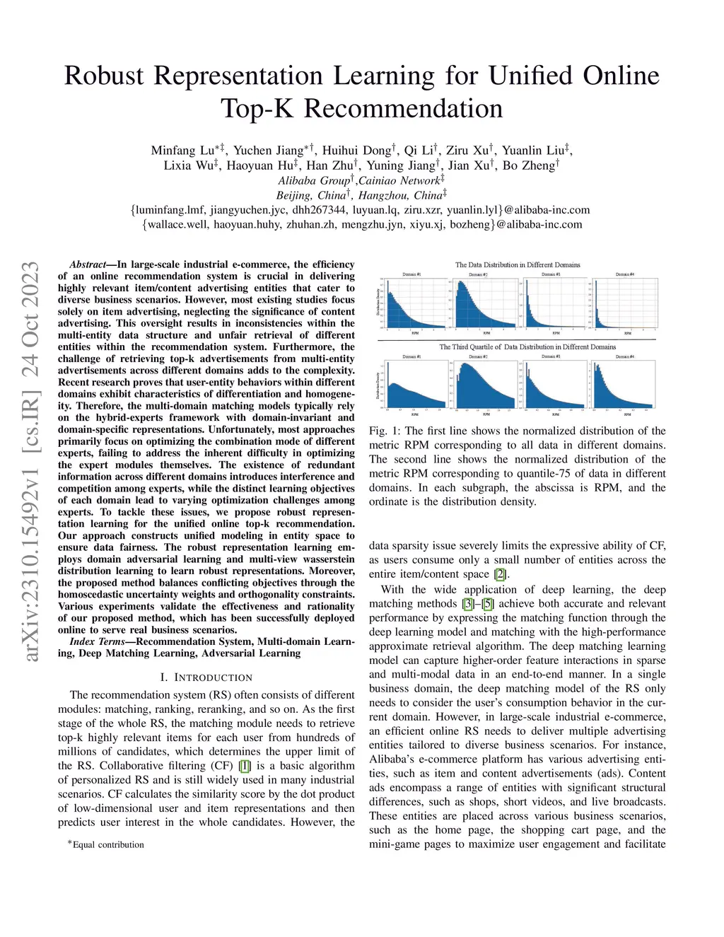 In large-scale industrial e-commerce, the efficiency of an online recommendation system is crucial in delivering highly relevant item/content advertising that caters to diverse business scenarios. However, most existing studies focus solely on item advertising, neglecting the significance of content advertising. This oversight results in inconsistencies within the multi-entity structure and unfair retrieval. Furthermore, the challenge of retrieving top-k advertisements from multi-entity advertisements across different domains adds to the complexity. Recent research proves that user-entity behaviors within different domains exhibit characteristics of differentiation and homogeneity. Therefore, the multi-domain matching models typically rely on the hybrid-experts framework with domain-invariant and domain-specific representations. Unfortunately, most approaches primarily focus on optimizing the combination mode of different experts, failing to address the inherent difficulty in optimizing the expert modules themselves. The existence of redundant information across different domains introduces interference and competition among experts, while the distinct learning objectives of each domain lead to varying optimization challenges among experts. To tackle these issues, we propose robust representation learning for the unified online top-k recommendation. Our approach constructs unified modeling in entity space to ensure data fairness. The robust representation learning employs domain adversarial learning and multi-view wasserstein distribution learning to learn robust representations. Moreover, the proposed method balances conflicting objectives through the homoscedastic uncertainty weights and orthogonality constraints. Various experiments validate the effectiveness and rationality of our proposed method, which has been successfully deployed online to serve real business scenarios.