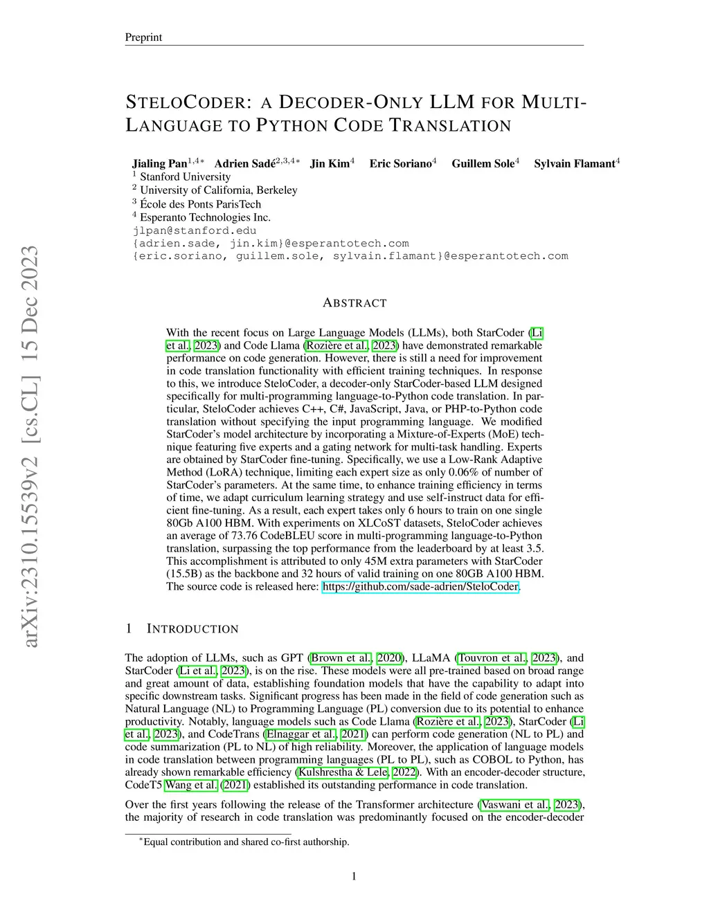 With the recent focus on Large Language Models (LLMs), both StarCoder (Li et al., 2023) and Code Llama (Rozi\`ere et al., 2023) have demonstrated remarkable performance in code generation. However, there is still a need for improvement in code translation functionality with efficient training techniques. In response to this, we introduce SteloCoder, a decoder-only StarCoder-based LLM designed specifically for multi-programming language-to-Python code translation. In particular, SteloCoder achieves C++, C#, JavaScript, Java, or PHP-to-Python code translation without specifying the input programming language. We modified StarCoder model architecture by incorporating a Mixture-of-Experts (MoE) technique featuring five experts and a gating network for multi-task handling. Experts are obtained by StarCoder fine-tuning. Specifically, we use a Low-Rank Adaptive Method (LoRA) technique, limiting each expert size as only 0.06% of number of StarCoder's parameters. At the same time, to enhance training efficiency in terms of time, we adopt curriculum learning strategy and use self-instruct data for efficient fine-tuning. As a result, each expert takes only 6 hours to train on one single 80Gb A100 HBM. With experiments on XLCoST datasets, SteloCoder achieves an average of 73.76 CodeBLEU score in multi-programming language-to-Python translation, surpassing the top performance from the leaderboard by at least 3.5. This accomplishment is attributed to only 45M extra parameters with StarCoder as the backbone and 32 hours of valid training on one 80GB A100 HBM. The source code is release here: https://github.com/sade-adrien/SteloCoder.