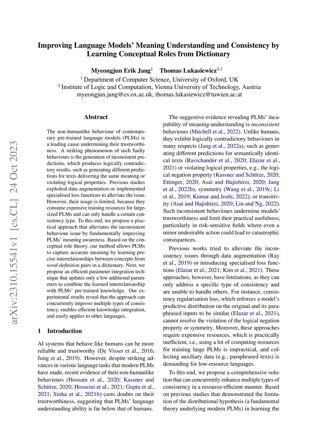 The non-humanlike behaviour of contemporary pre-trained language models (PLMs) is a leading cause undermining their trustworthiness. A striking phenomenon of such faulty behaviours is the generation of inconsistent predictions, which produces logically contradictory results, such as generating different predictions for texts delivering the same meaning or violating logical properties. Previous studies exploited data augmentation or implemented specialised loss functions to alleviate the issue. However, their usage is limited, because they consume expensive training resources for large-sized PLMs and can only handle a certain consistency type. To this end, we propose a practical approach that alleviates the inconsistent behaviour issue by fundamentally improving PLMs' meaning awareness. Based on the conceptual role theory, our method allows PLMs to capture accurate meaning by learning precise interrelationships between concepts from word-definition pairs in a dictionary. Next, we propose an efficient parameter integration technique that updates only a few additional parameters to combine the learned interrelationship with PLMs' pre-trained knowledge. Our experimental results reveal that the approach can concurrently improve multiple types of consistency, enables efficient knowledge integration, and easily applies to other languages.