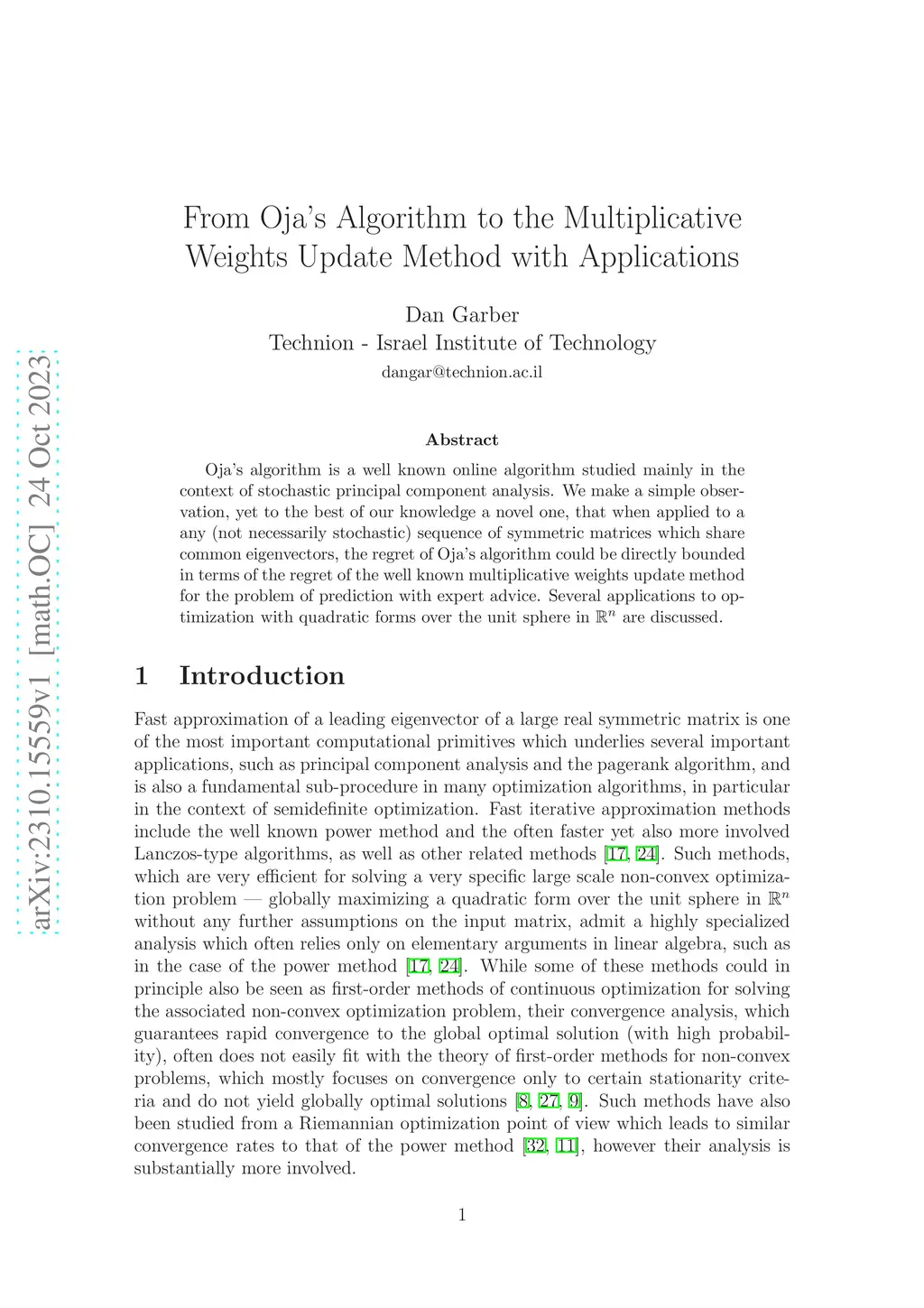 Oja's algorithm is a well known online algorithm studied mainly in the context of stochastic principal component analysis. We make a simple observation, yet to the best of our knowledge a novel one, that when applied to a any (not necessarily stochastic) sequence of symmetric matrices which share common eigenvectors, the regret of Oja's algorithm could be directly bounded in terms of the regret of the well known multiplicative weights update method for the problem of prediction with expert advice. Several applications to optimization with quadratic forms over the unit sphere in are discussed.