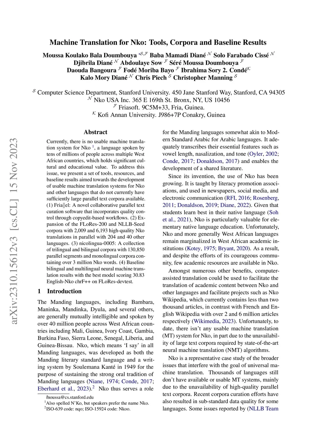 Machine Translation for Nko: Tools, Corpora and Baseline Results
