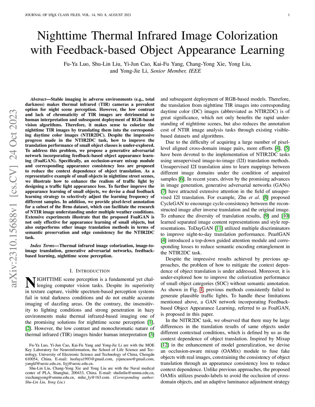 Stable imaging in adverse environments (e.g., total darkness) makes thermal infrared (TIR) cameras a prevalent option for night scene perception. However, the low contrast and lack of chromaticity of TIR images are detrimental to human interpretation and subsequent deployment of RGB-based vision algorithms. Therefore, it makes sense to colorize the nighttime TIR images by translating them into the corresponding daytime color images (NTIR2DC). Despite the impressive progress made in the NTIR2DC task, how to improve the translation performance of small object classes is under-explored. To address this problem, we propose a generative adversarial network incorporating feedback-based object appearance learning (FoalGAN). Specifically, an occlusion-aware mixup module and corresponding appearance consistency loss are proposed to reduce the context dependence of object translation. As a representative example of small objects in nighttime street scenes, we illustrate how to enhance the realism of traffic light by designing a traffic light appearance loss. To further improve the appearance learning of small objects, we devise a dual feedback learning strategy to selectively adjust the learning frequency of different samples. In addition, we provide pixel-level annotation for a subset of the Brno dataset, which can facilitate the research of NTIR image understanding under multiple weather conditions. Extensive experiments illustrate that the proposed FoalGAN is not only effective for appearance learning of small objects, but also outperforms other image translation methods in terms of semantic preservation and edge consistency for the NTIR2DC task.