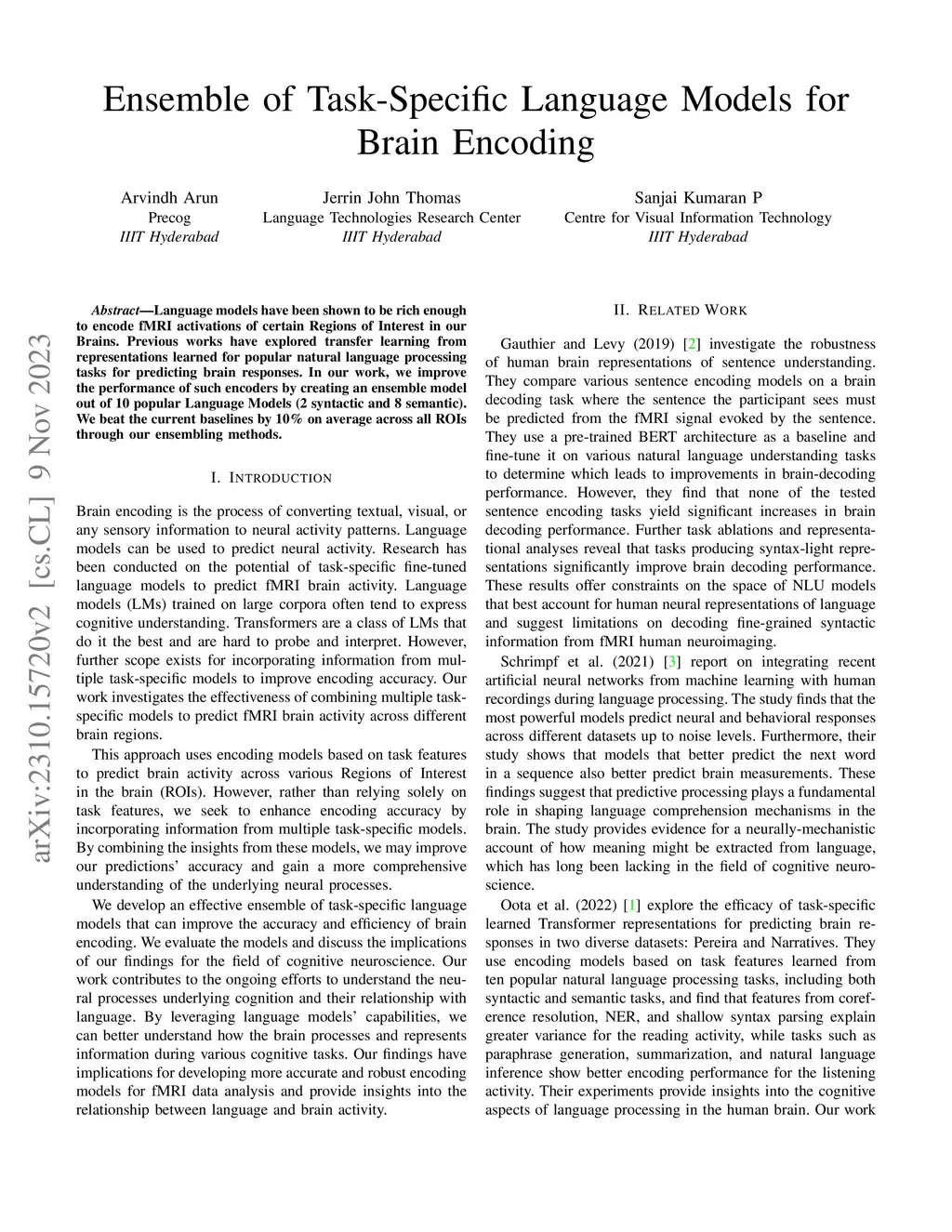 Language models have been shown to be rich enough to encode fMRI activations of certain Regions of Interest in our Brains. Previous works have explored transfer learning from representations learned for popular natural language processing tasks for predicting brain responses. In our work, we improve the performance of such encoders by creating an ensemble model out of 10 popular Language Models (2 syntactic and 8 semantic). We beat the current baselines by 10% on average across all ROIs through our ensembling methods.