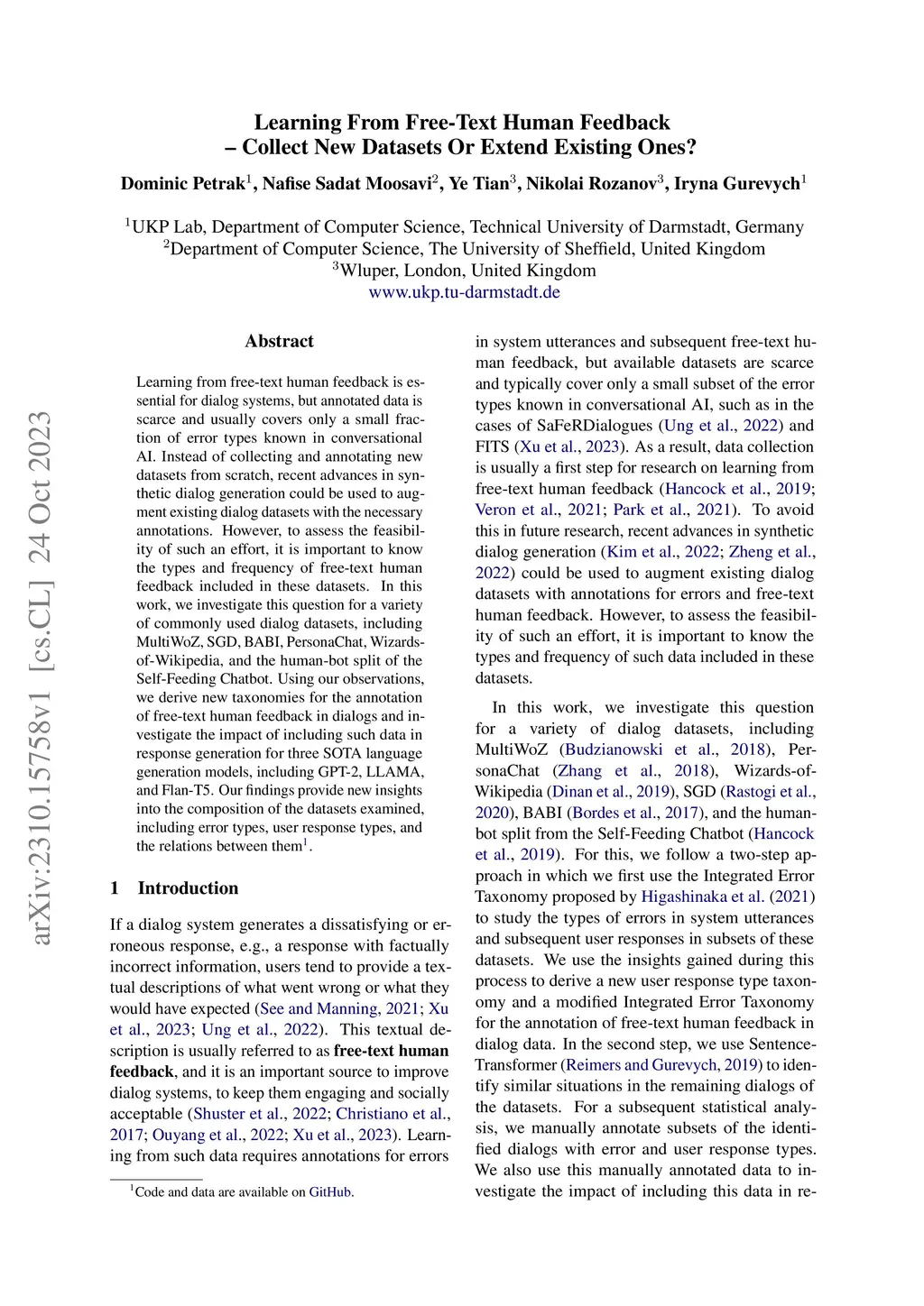 Learning From Free-Text Human Feedback -- Collect New Datasets Or Extend