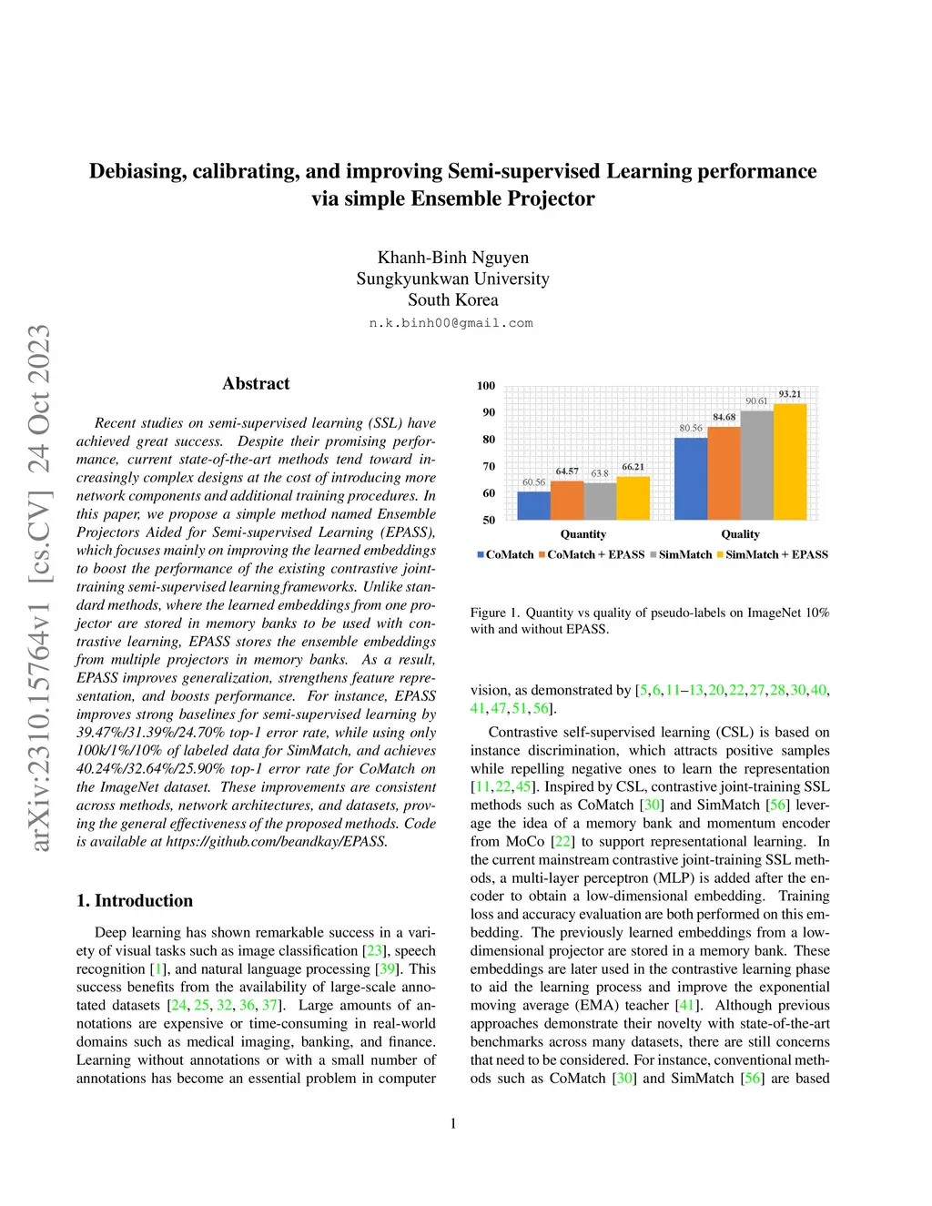 Recent studies on semi-supervised learning (SSL) have achieved great success. Despite their promising performance, current state-of-the-art methods tend toward increasingly complex designs at the cost of introducing more network components and additional training procedures. In this paper, we propose a simple method named Ensemble Projectors Aided for Semi-supervised Learning (EPASS), which focuses mainly on improving the learned embeddings to boost the performance of the existing contrastive joint-training semi-supervised learning frameworks. Unlike standard methods, where the learned embeddings from one projector are stored in memory banks to be used with contrastive learning, EPASS stores the ensemble embeddings from multiple projectors in memory banks. As a result, EPASS improves generalization, strengthens feature representation, and boosts performance. For instance, EPASS improves strong baselines for semi-supervised learning by 39.47\%/31.39\%/24.70\% top-1 error rate, while using only 100k/1\%/10\% of labeled data for SimMatch, and achieves 40.24\%/32.64\%/25.90\% top-1 error rate for CoMatch on the ImageNet dataset. These improvements are consistent across methods, network architectures, and datasets, proving the general effectiveness of the proposed methods. Code is available at https://github.com/beandkay/EPASS.