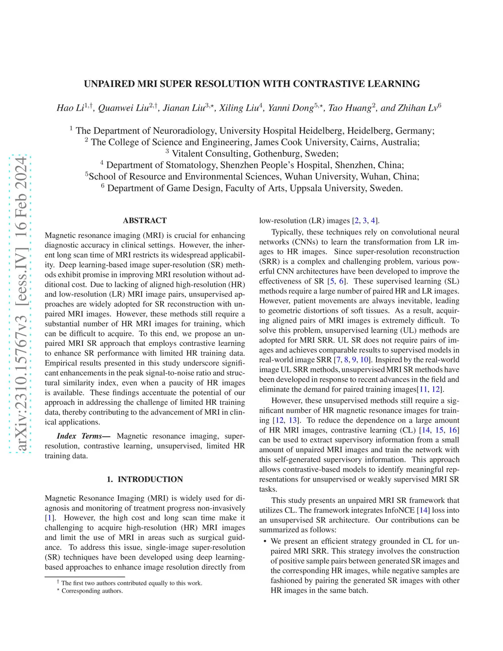 Unpaired MRI Super Resolution with Self-Supervised Contrastive Learning