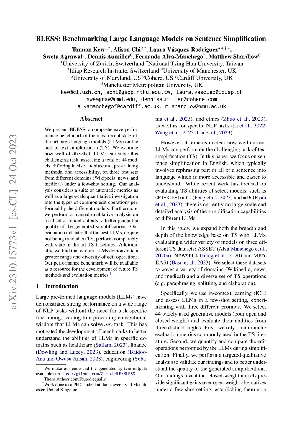 BLESS: Benchmarking Large Language Models on Sentence Simplification