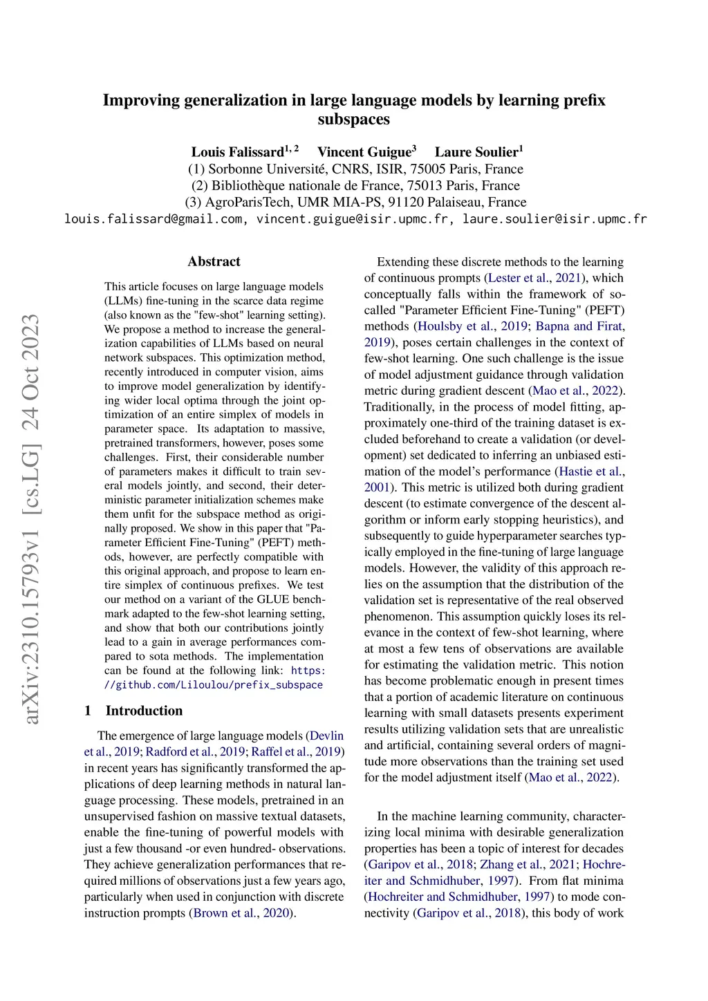 This article focuses on large language models (LLMs) fine-tuning in the scarce data regime (also known as the "few-shot" learning setting). We propose a method to increase the generalization capabilities of LLMs based on neural network subspaces. This optimization method, recently introduced in computer vision, aims to improve model generalization by identifying wider local optima through the joint optimization of an entire simplex of models in parameter space. Its adaptation to massive, pretrained transformers, however, poses some challenges. First, their considerable number of parameters makes it difficult to train several models jointly, and second, their deterministic parameter initialization schemes make them unfit for the subspace method as originally proposed. We show in this paper that "Parameter Efficient Fine-Tuning" (PEFT) methods, however, are perfectly compatible with this original approach, and propose to learn entire simplex of continuous prefixes. We test our method on a variant of the GLUE benchmark adapted to the few-shot learning setting, and show that both our contributions jointly lead to a gain in average performances compared to sota methods. The implementation can be found at the following link: https://github.com/Liloulou/prefix_subspace