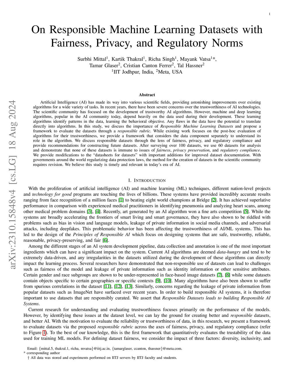 On Responsible Machine Learning Datasets with Fairness, Privacy, and