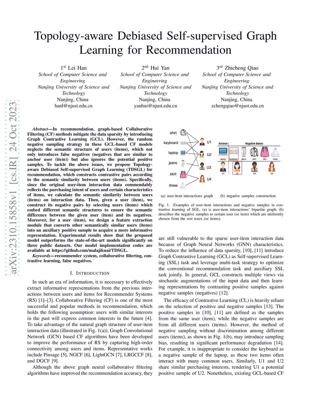 In recommendation, graph-based Collaborative Filtering (CF) methods mitigate the data sparsity by introducing Graph Contrastive Learning (GCL). However, the random negative sampling strategy in these GCL-based CF models neglects the semantic structure of users (items), which not only introduces false negatives (negatives that are similar to anchor user (item)) but also ignores the potential positive samples. To tackle the above issues, we propose Topology-aware Debiased Self-supervised Graph Learning (TDSGL) for recommendation, which constructs contrastive pairs according to the semantic similarity between users (items). Specifically, since the original user-item interaction data commendably reflects the purchasing intent of users and certain characteristics of items, we calculate the semantic similarity between users (items) on interaction data. Then, given a user (item), we construct its negative pairs by selecting users (items) which embed different semantic structures to ensure the semantic difference between the given user (item) and its negatives. Moreover, for a user (item), we design a feature extraction module that converts other semantically similar users (items) into an auxiliary positive sample to acquire a more informative representation. Experimental results show that the proposed model outperforms the state-of-the-art models significantly on three public datasets. Our model implementation codes are available at https://github.com/malajikuai/TDSGL.