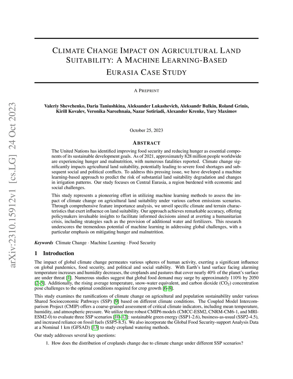 The United Nations has identified improving food security and reducing hunger as essential components of its sustainable development goals. As of 2021, approximately 828 million people worldwide are experiencing hunger and malnutrition, with numerous fatalities reported. Climate change significantly impacts agricultural land suitability, potentially leading to severe food shortages and subsequent social and political conflicts. To address this pressing issue, we have developed a machine learning-based approach to predict the risk of substantial land suitability degradation and changes in irrigation patterns. Our study focuses on Central Eurasia, a region burdened with economic and social challenges. This study represents a pioneering effort in utilizing machine learning methods to assess the impact of climate change on agricultural land suitability under various carbon emissions scenarios. Through comprehensive feature importance analysis, we unveil specific climate and terrain characteristics that exert influence on land suitability. Our approach achieves remarkable accuracy, offering policymakers invaluable insights to facilitate informed decisions aimed at averting a humanitarian crisis, including strategies such as the provision of additional water and fertilizers. This research underscores the tremendous potential of machine learning in addressing global challenges, with a particular emphasis on mitigating hunger and malnutrition.