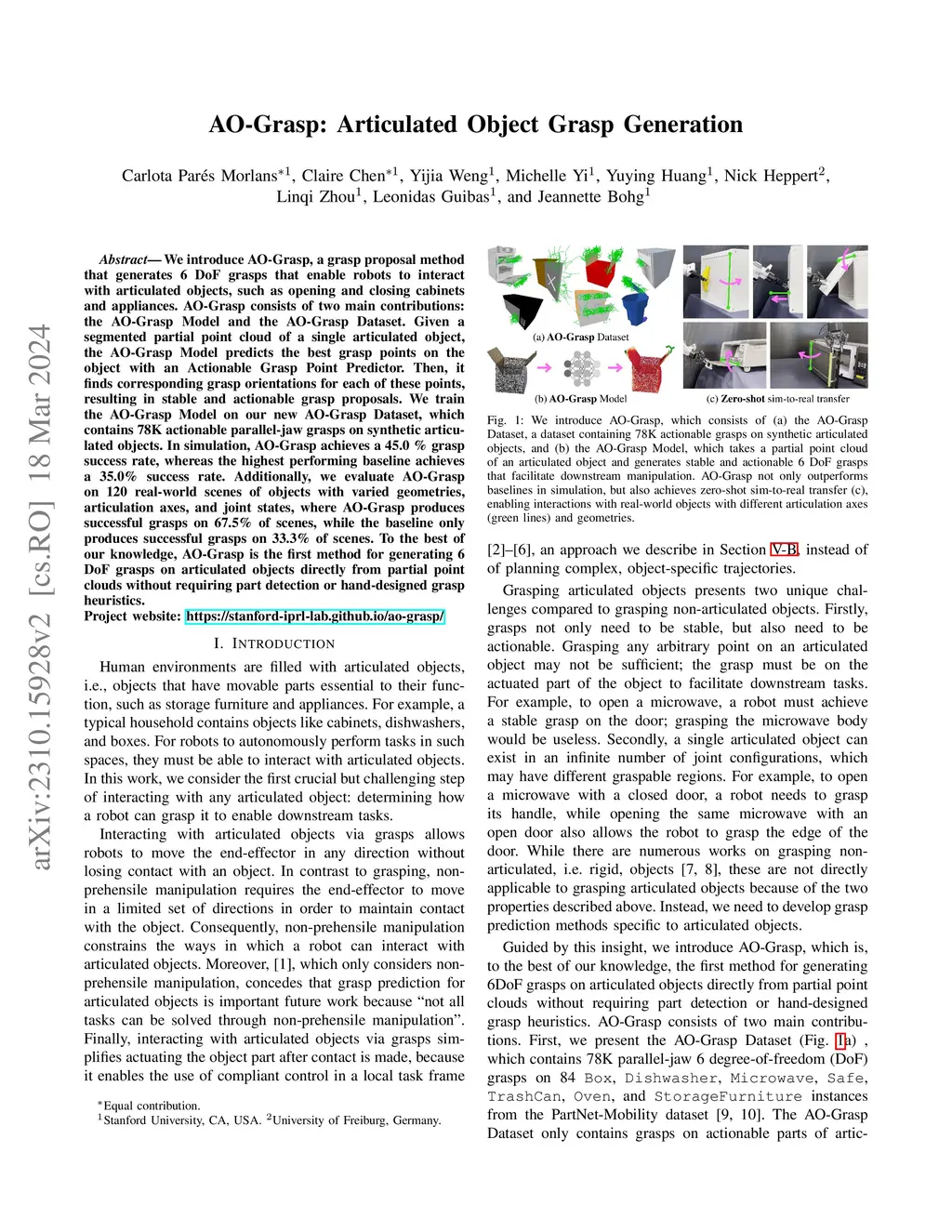 We introduce AO-Grasp, a grasp proposal method that generates 6 DoF grasps that enable robots to interact with articulated objects, such as opening and closing cabinets and appliances. AO-Grasp consists of two main contributions: the AO-Grasp Model and the AO-Grasp Dataset. Given a segmented partial point cloud of a single articulated object, the AO-Grasp Model predicts the best grasp points on the object with an Actionable Grasp Point Predictor. Then, it finds corresponding grasp orientations for each of these points, resulting in stable and actionable grasp proposals. We train the AO-Grasp Model on our new AO-Grasp Dataset, which contains 78K actionable parallel-jaw grasps on synthetic articulated objects. In simulation, AO-Grasp achieves a 45.0 % grasp success rate, whereas the highest performing baseline achieves a 35.0% success rate. Additionally, we evaluate AO-Grasp on 120 real-world scenes of objects with varied geometries, articulation axes, and joint states, where AO-Grasp produces successful grasps on 67.5% of scenes, while the baseline only produces successful grasps on 33.3% of scenes. To the best of our knowledge, AO-Grasp is the first method for generating 6 DoF grasps on articulated objects directly from partial point clouds without requiring part detection or hand-designed grasp heuristics. Project website:this https URL