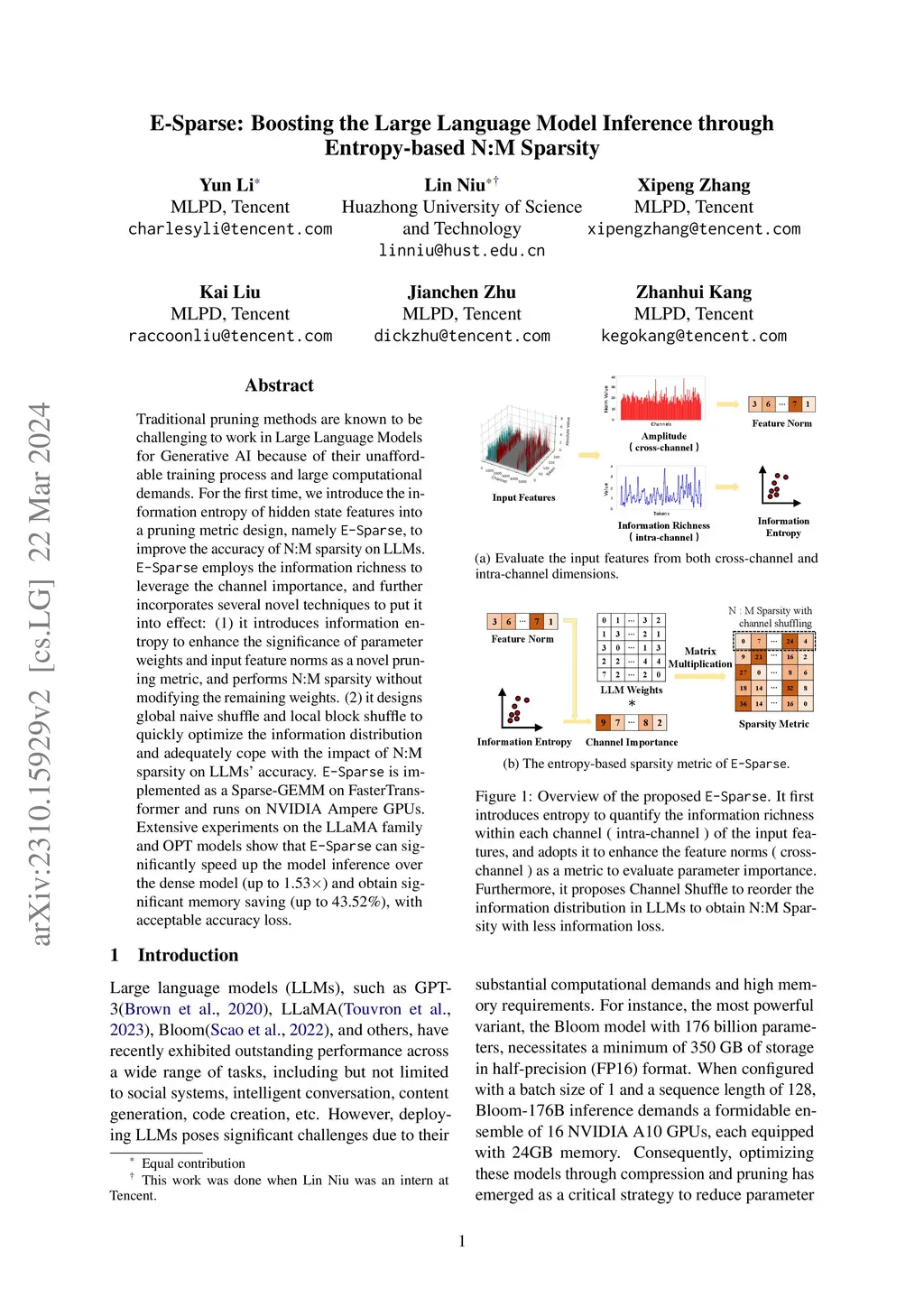 Traditional pruning methods are known to be challenging to work in Large Language Models (LLMs) for Generative AI because of their unaffordable training process and large computational demands. For the first time, we introduce the information entropy of hidden state features into a pruning metric design, namely E-Sparse, to improve the accuracy of N:M sparsity on LLM. E-Sparse employs the information richness to leverage the channel importance, and further incorporates several novel techniques to put it into effect: (1) it introduces information entropy to enhance the significance of parameter weights and input feature norms as a novel pruning metric, and performs N:M sparsity without modifying the remaining weights. (2) it designs global naive shuffle and local block shuffle to quickly optimize the information distribution and adequately cope with the impact of N:M sparsity on LLMs' accuracy. E-Sparse is implemented as a Sparse-GEMM on FasterTransformer and runs on NVIDIA Ampere GPUs. Extensive experiments on the LLaMA family and OPT models show that E-Sparse can significantly speed up the model inference over the dense model (up to 1.53X) and obtain significant memory saving (up to 43.52%), with acceptable accuracy loss.